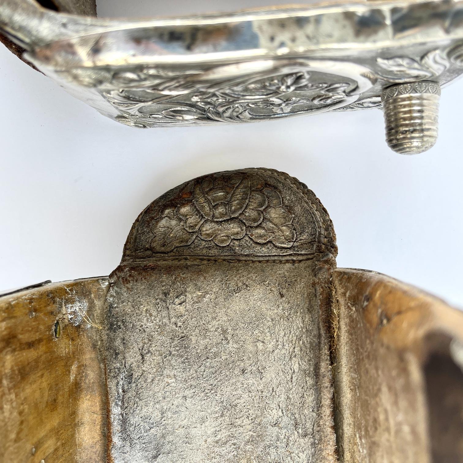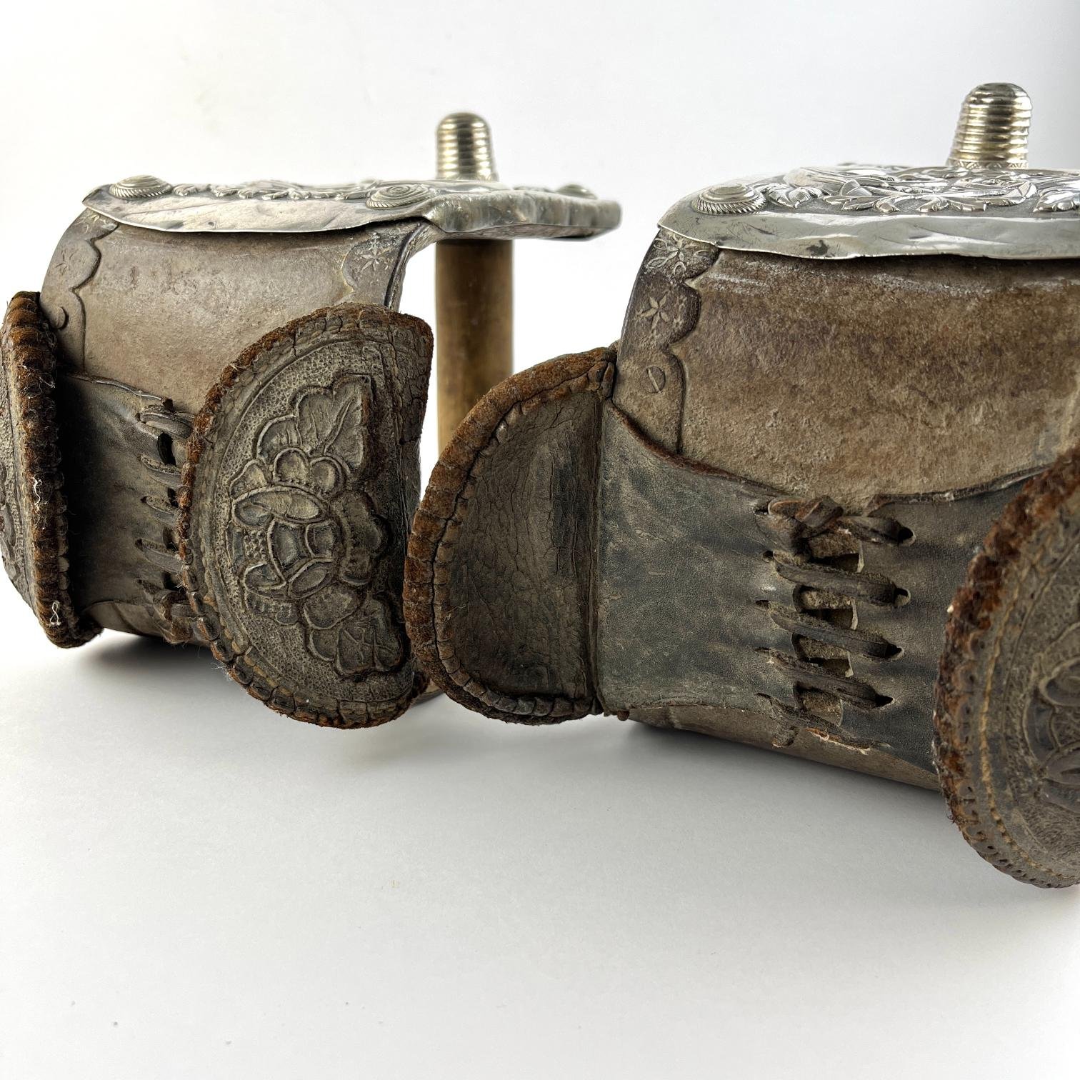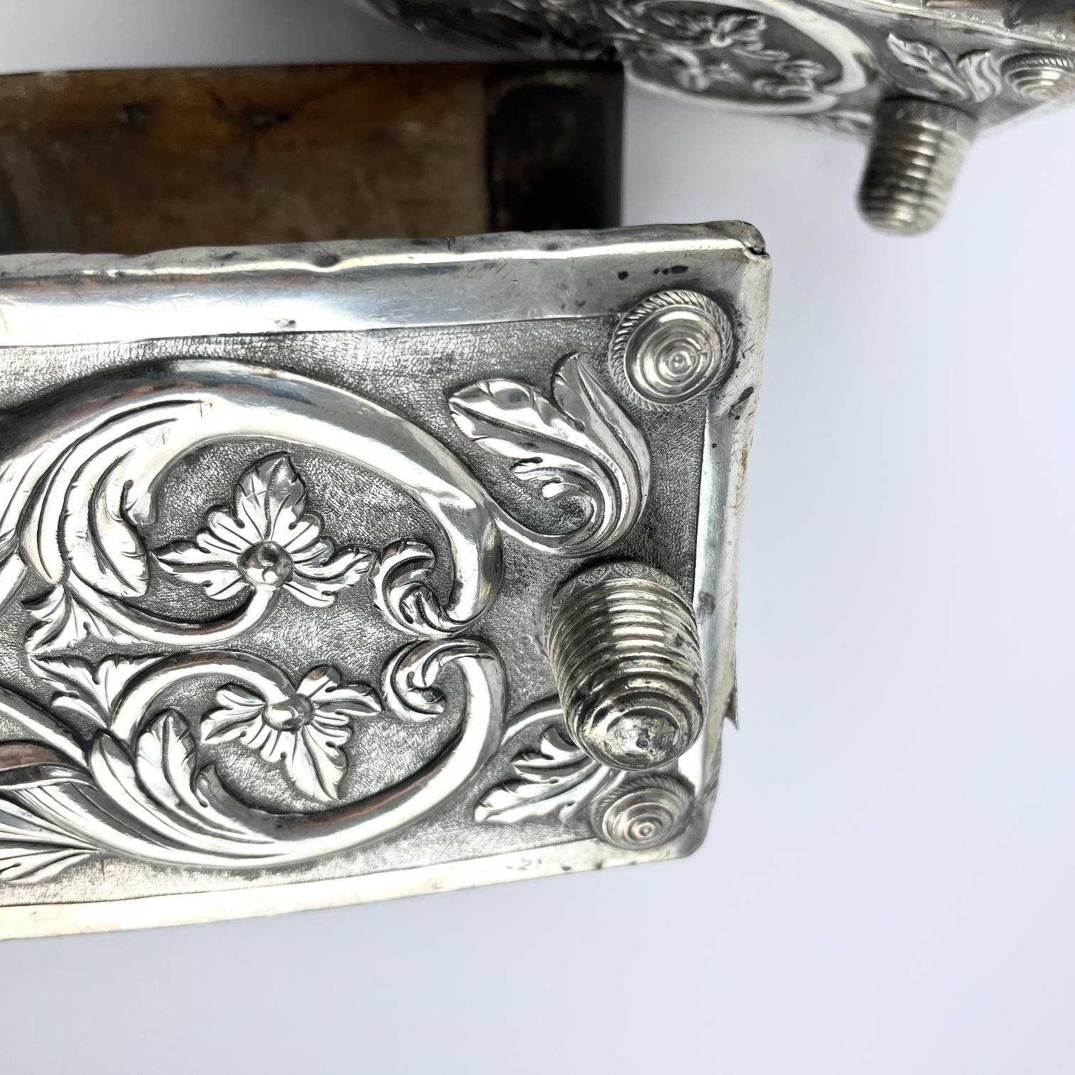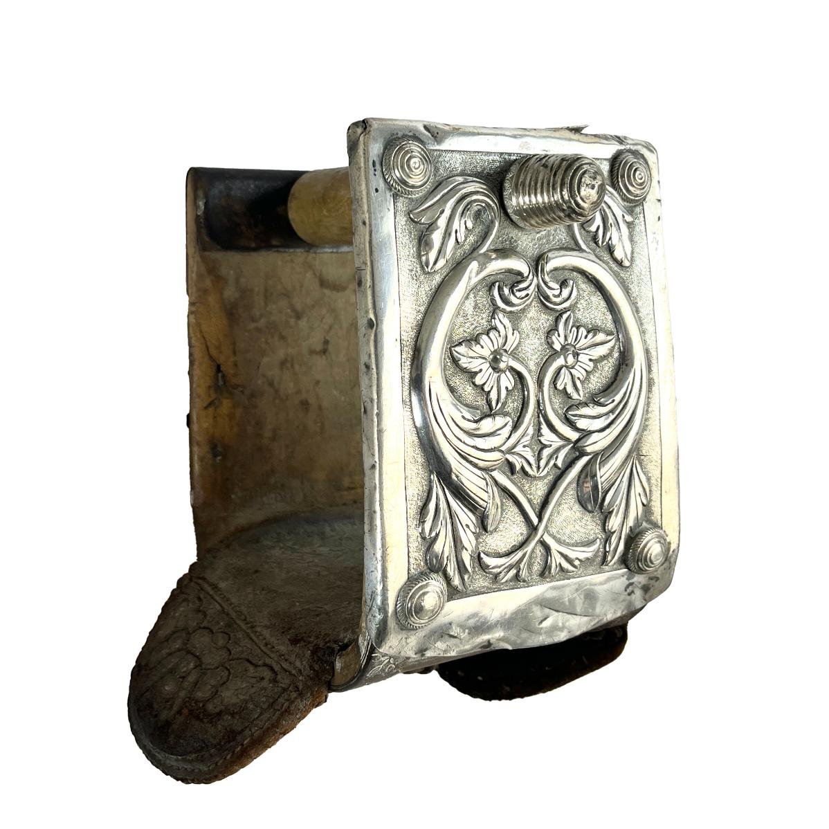 Par de estribos mexicanos s. XVIII-XIX en madera tallada y forrada en hierro forjado decorado «flores», con laterales externos forrados en placas de plata cincelada y repujada «hojas y flores», y pisada forrada en cuero marrón repujado «hojas y flores». Alto 16 cm. Proveniencia: colección Familia von Buch, Argentina.