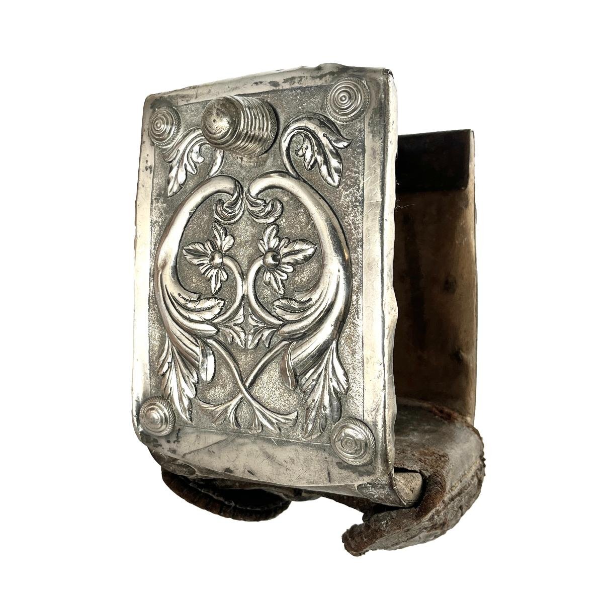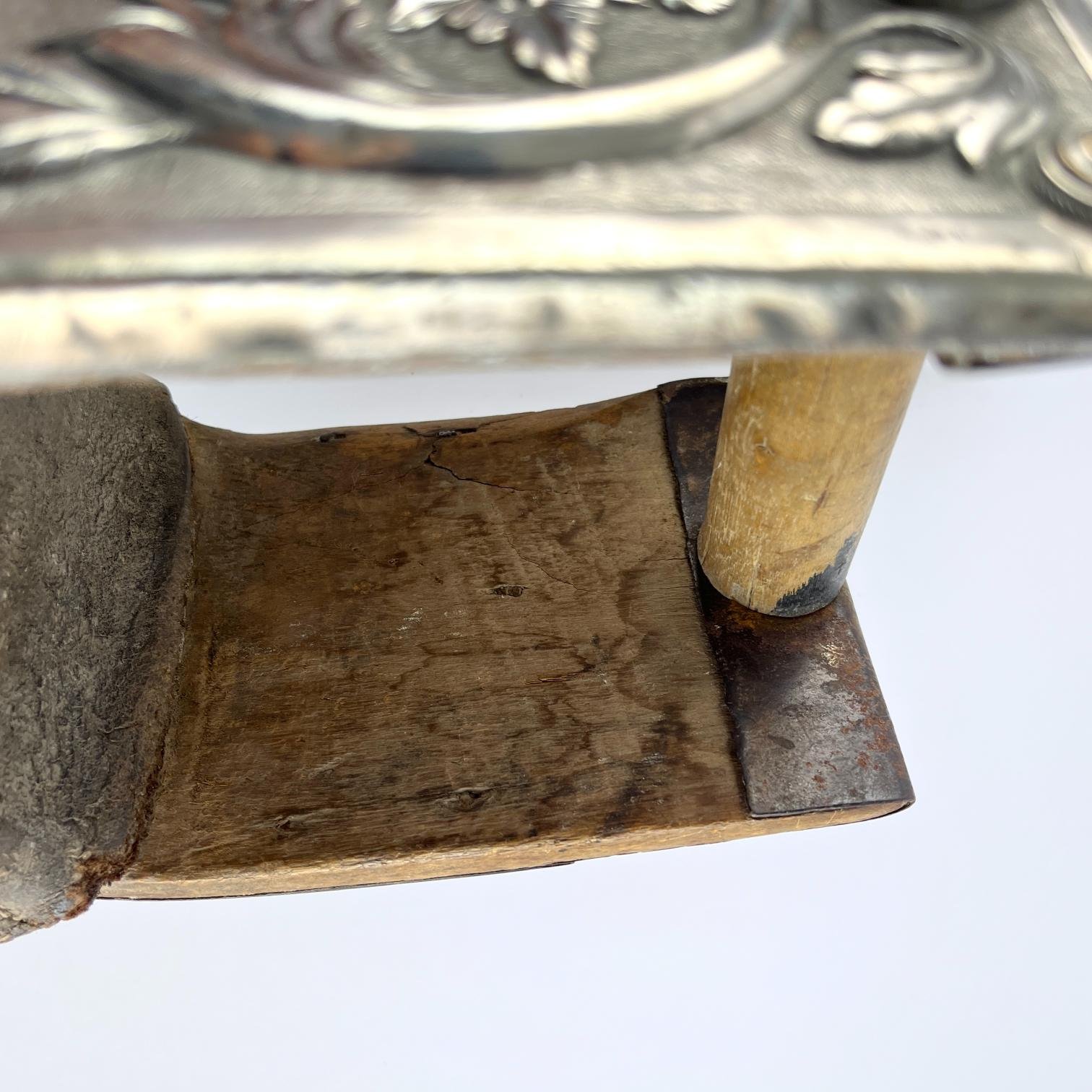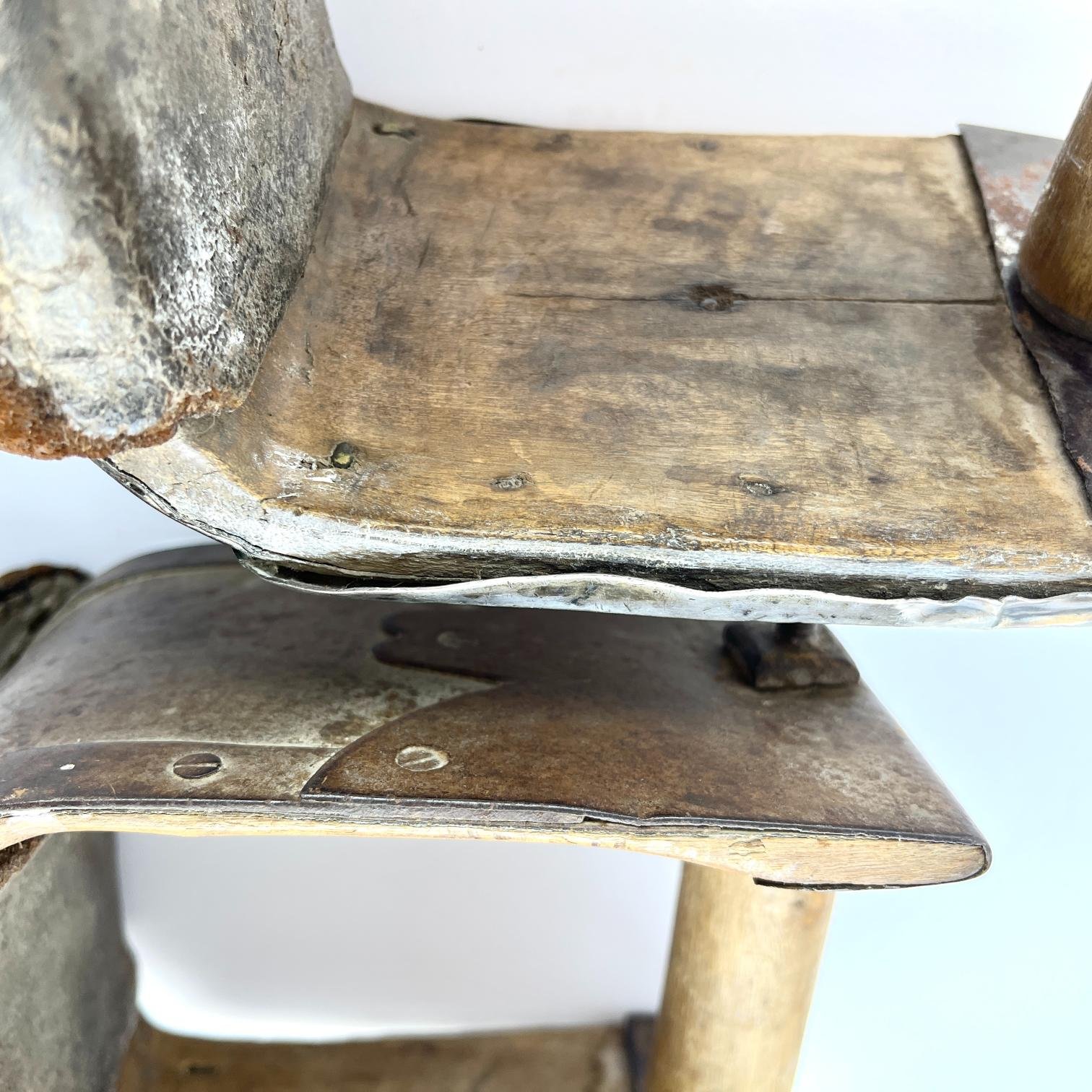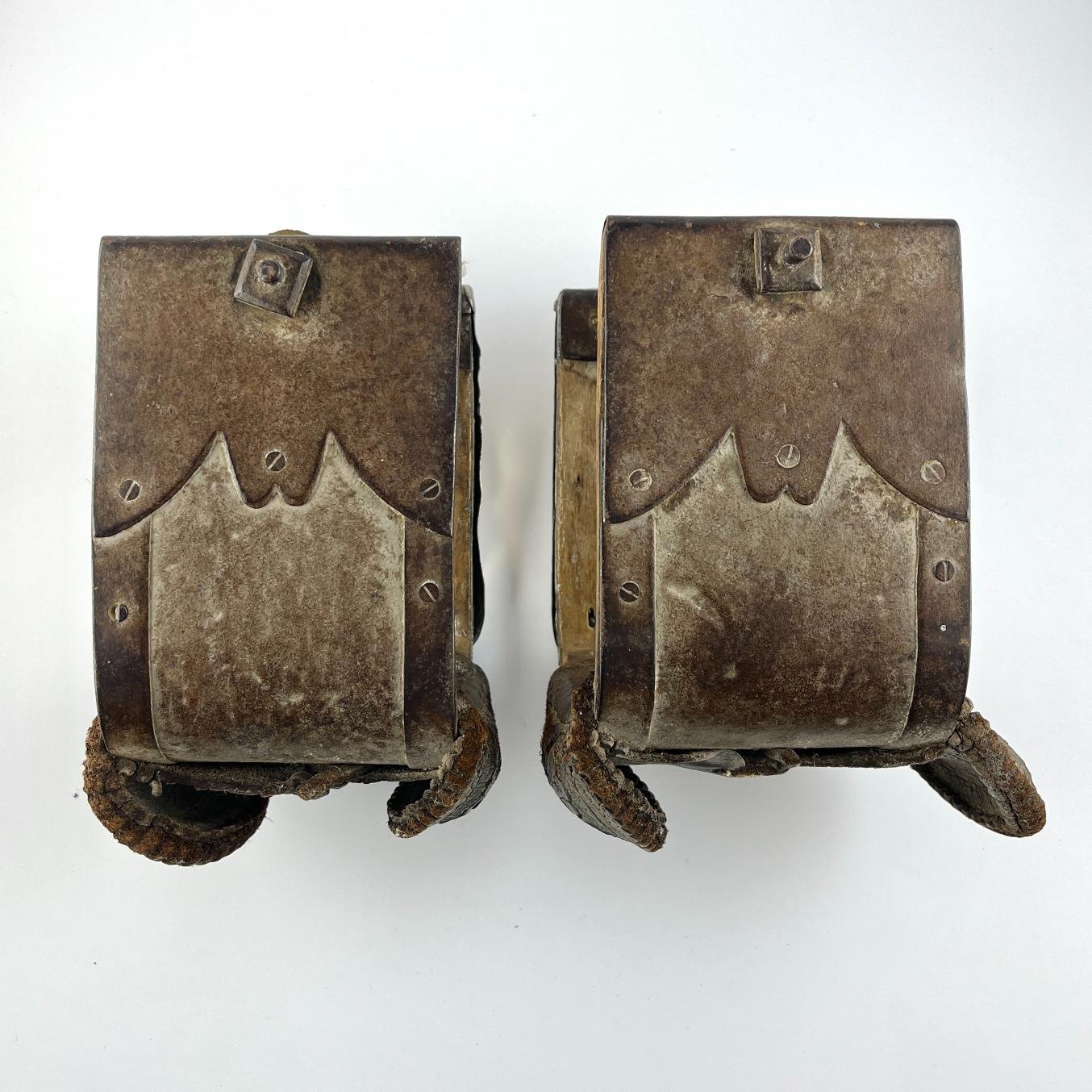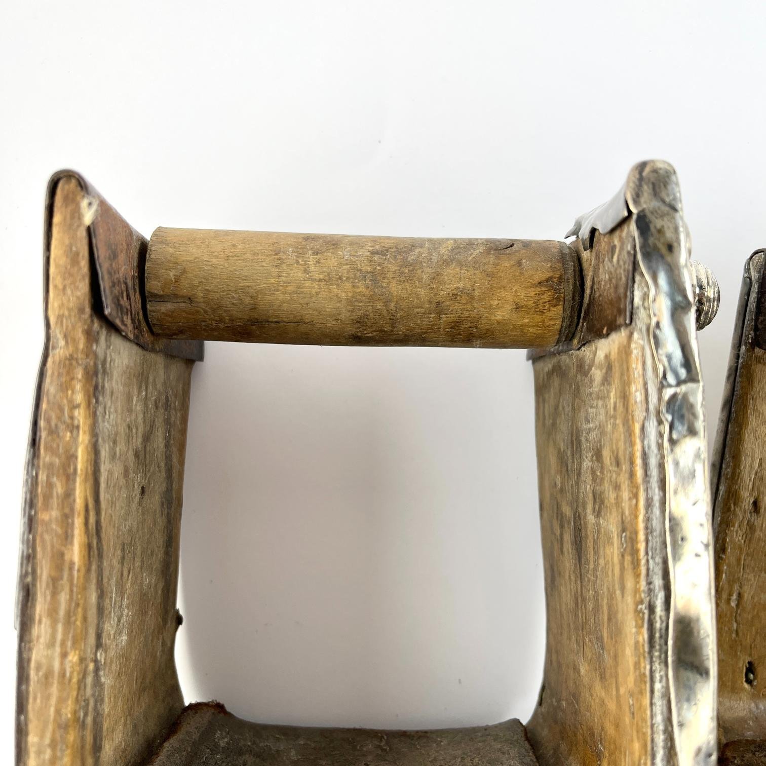 Par de estribos mexicanos s. XVIII-XIX en madera tallada y forrada en hierro forjado decorado «flores», con laterales externos forrados en placas de plata cincelada y repujada «hojas y flores», y pisada forrada en cuero marrón repujado «hojas y flores». Alto 16 cm. Proveniencia: colección Familia von Buch, Argentina.