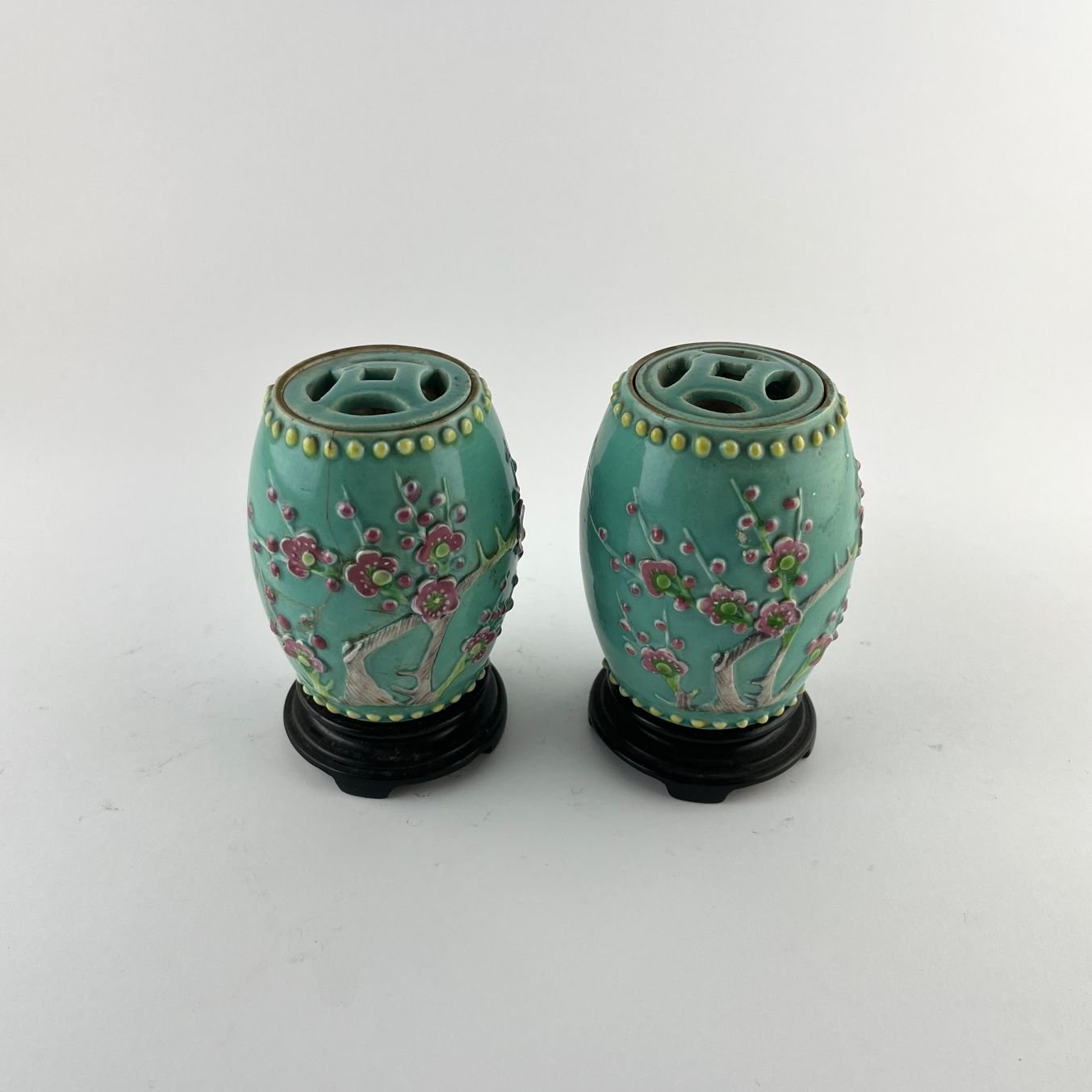 Par de incensarios chinos en porcelana familia rosa decorados «flores». Presentados sobre bases en madera ebanizada. Alto total 10 cm. Restaurados.