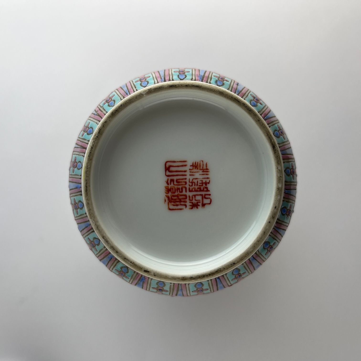 Par de jarrones chinos en porcelana familia rosa decorados “escenas típicas”. 13.8 x 9 cm,.