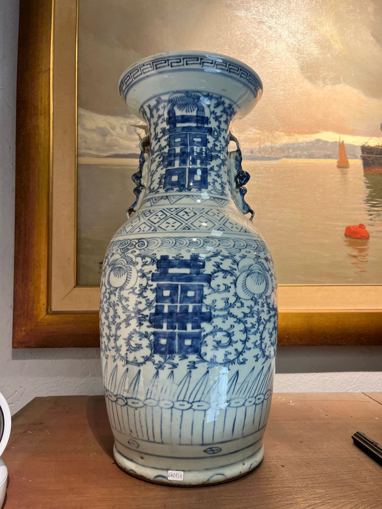 Par de jarrones chinos en porcelana azul y blanca decorada «símbolos shou de la felicidad». 44 x 20 cm. Uno restaurado.