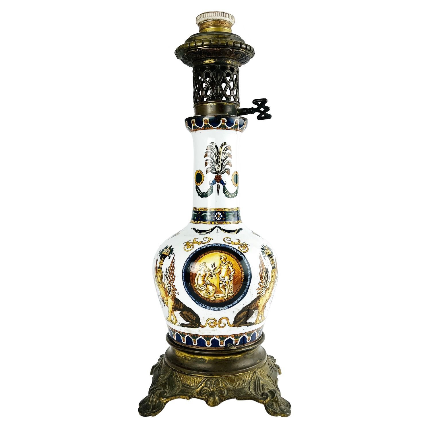 Par de lámparas europeas en cerámica decorada «ángeles y dragones», con bases y monturas en bronce. Alto 40 cm.