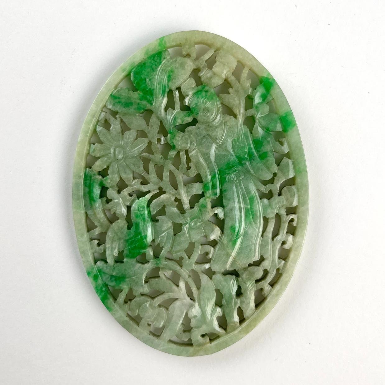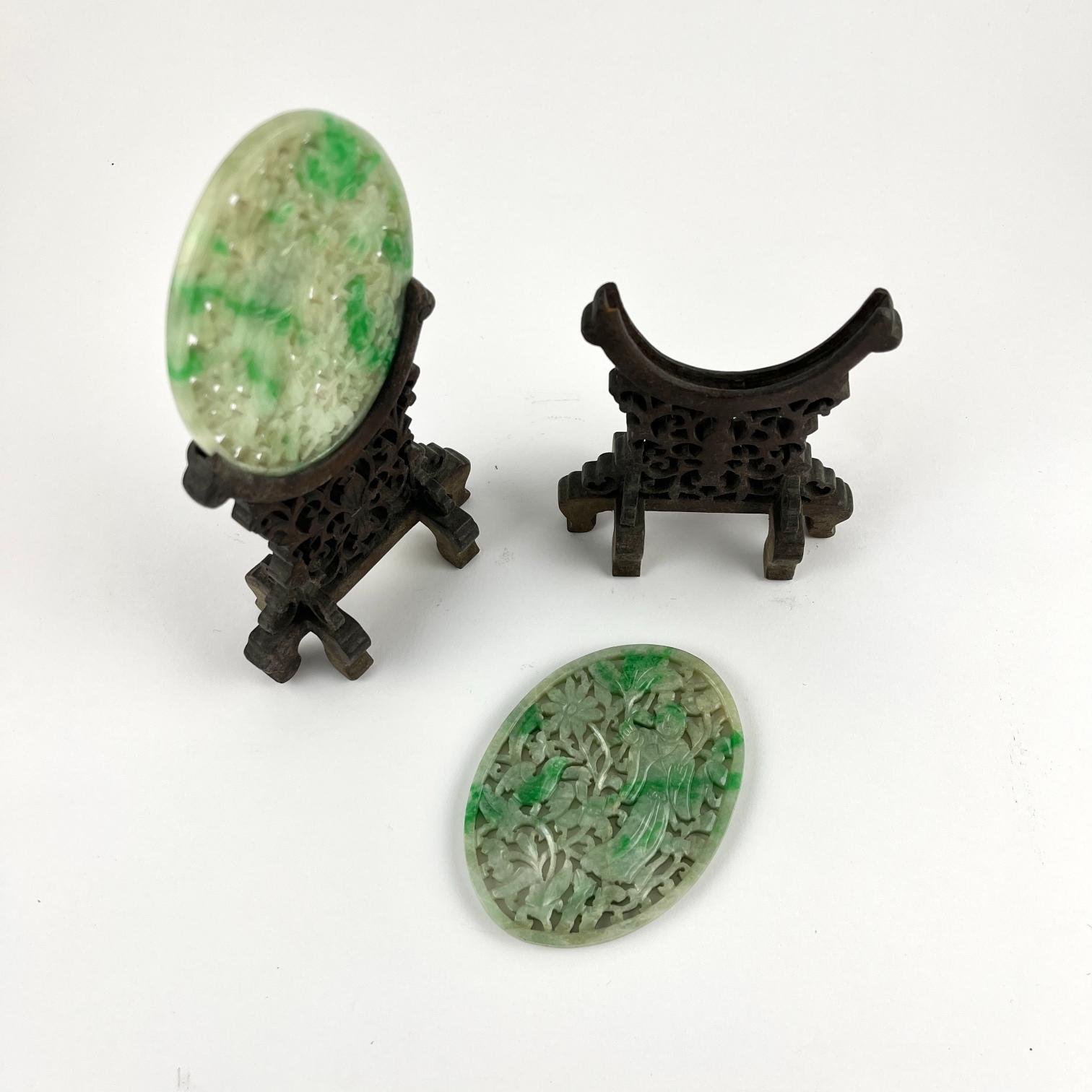 Par de medallones ovales chinos en jade verde calado «cortesana y ave». 9 x 6,5 cm. Presentados en soportes en madera calada y tallada. Ca. 1900. Alto total 15,5 cm.