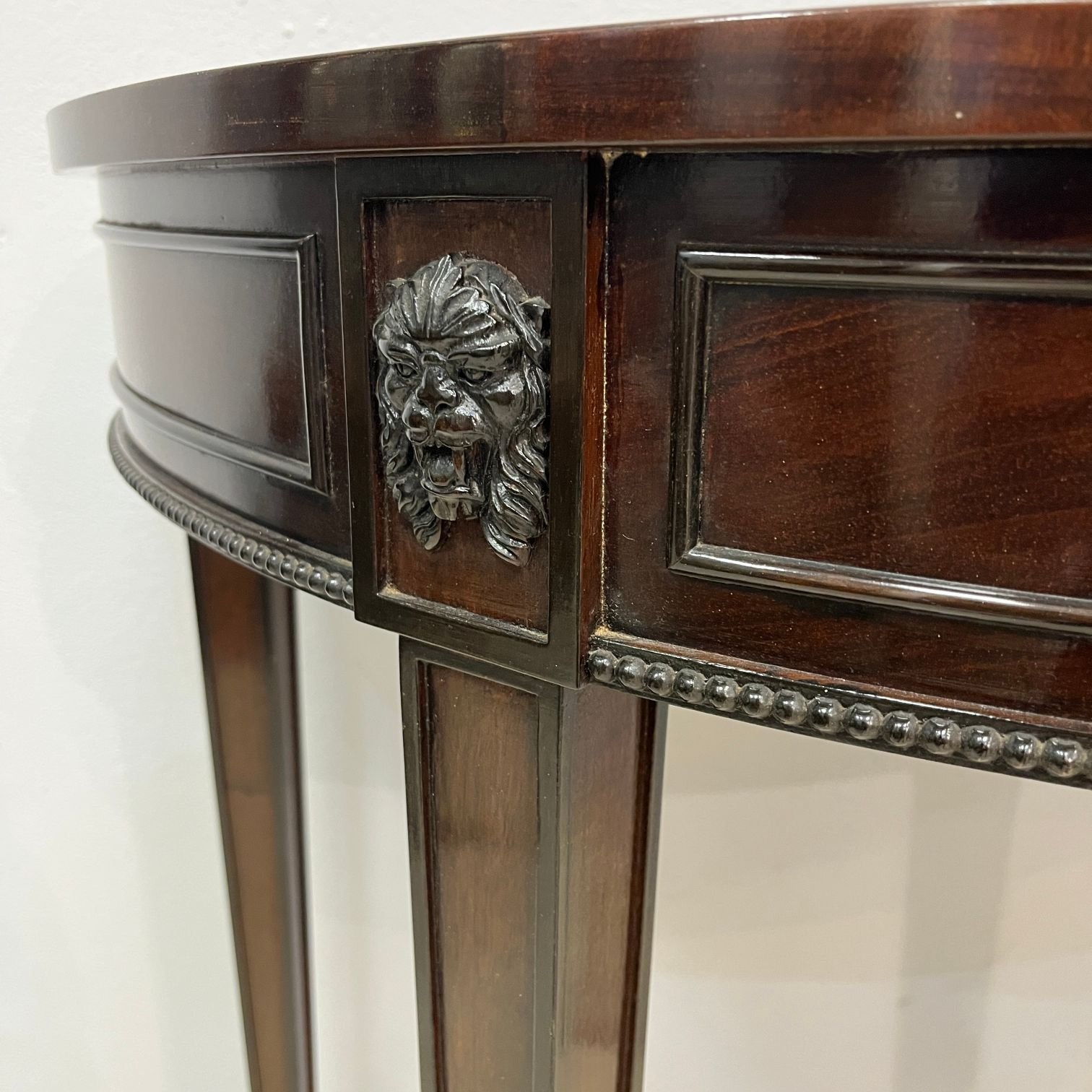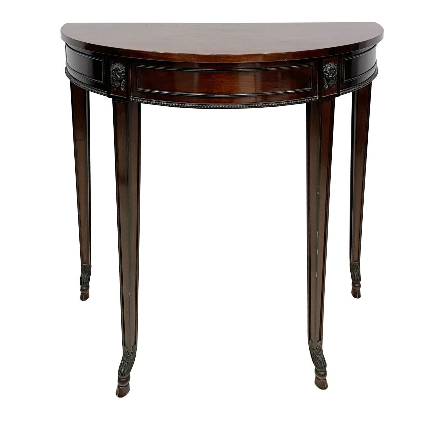 Par de mesas de arrimo inglesas en madera de caoba, medio punto. Borde perlado, cuatro patas esculturadas «pata de cabra» y laterales esculturados «cabeza de león». 90 x 100 x 50 cm.