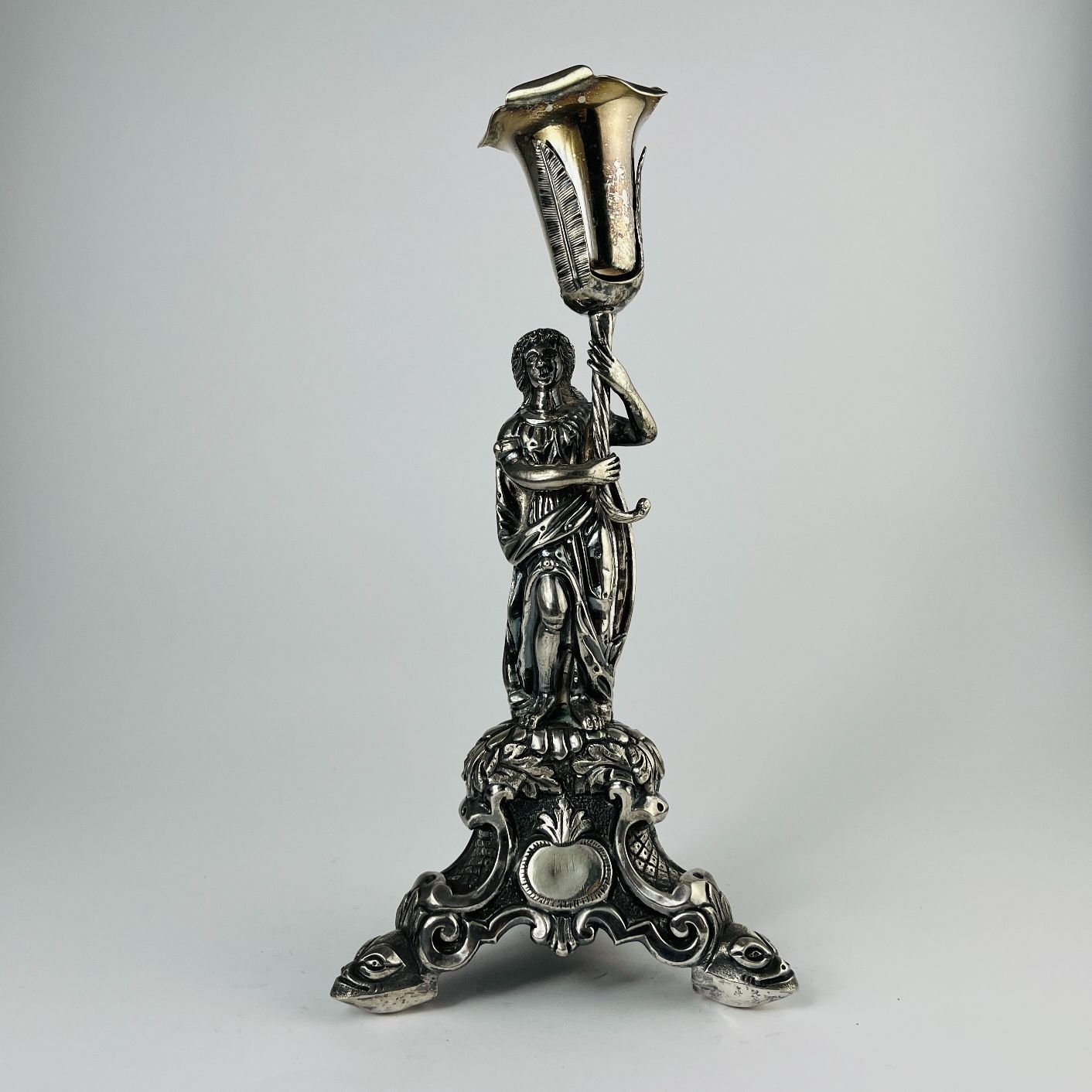 Par de paliteros portugueses en plata esculturados «damas con copones», sobre bases triangulares de tres patas esculturadas «caras». Altos 23 cm.