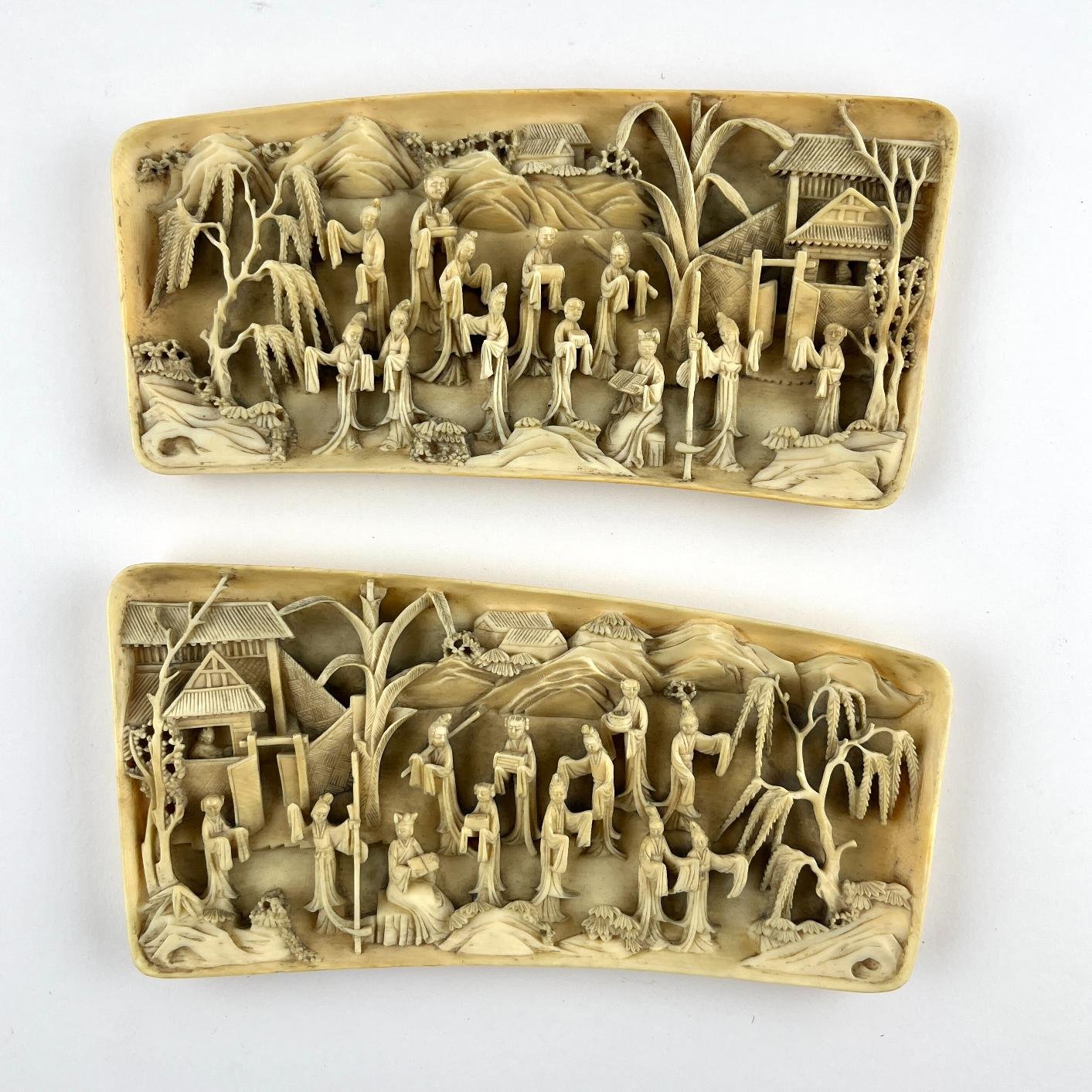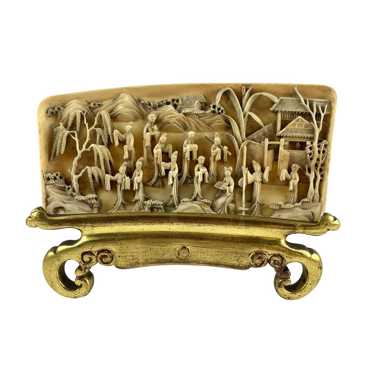 Par de paneles chinos s. XIX en marfil tallado «escenas palaciegas» en altorrelieve. 8 x 16,5 cm. Presentados sobre soportes en madera tallada y dorada. Alto total 11 cm.