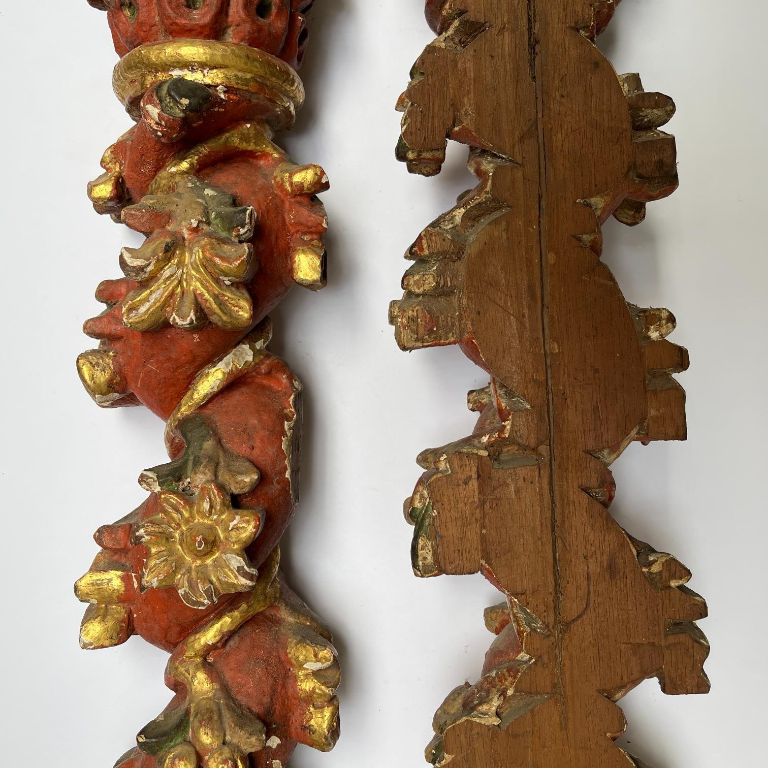 Par de pilastras hispanoamericanas s. XVIII en madera tallada, dorada y policromada con realces en oro. Alto 62 cm.