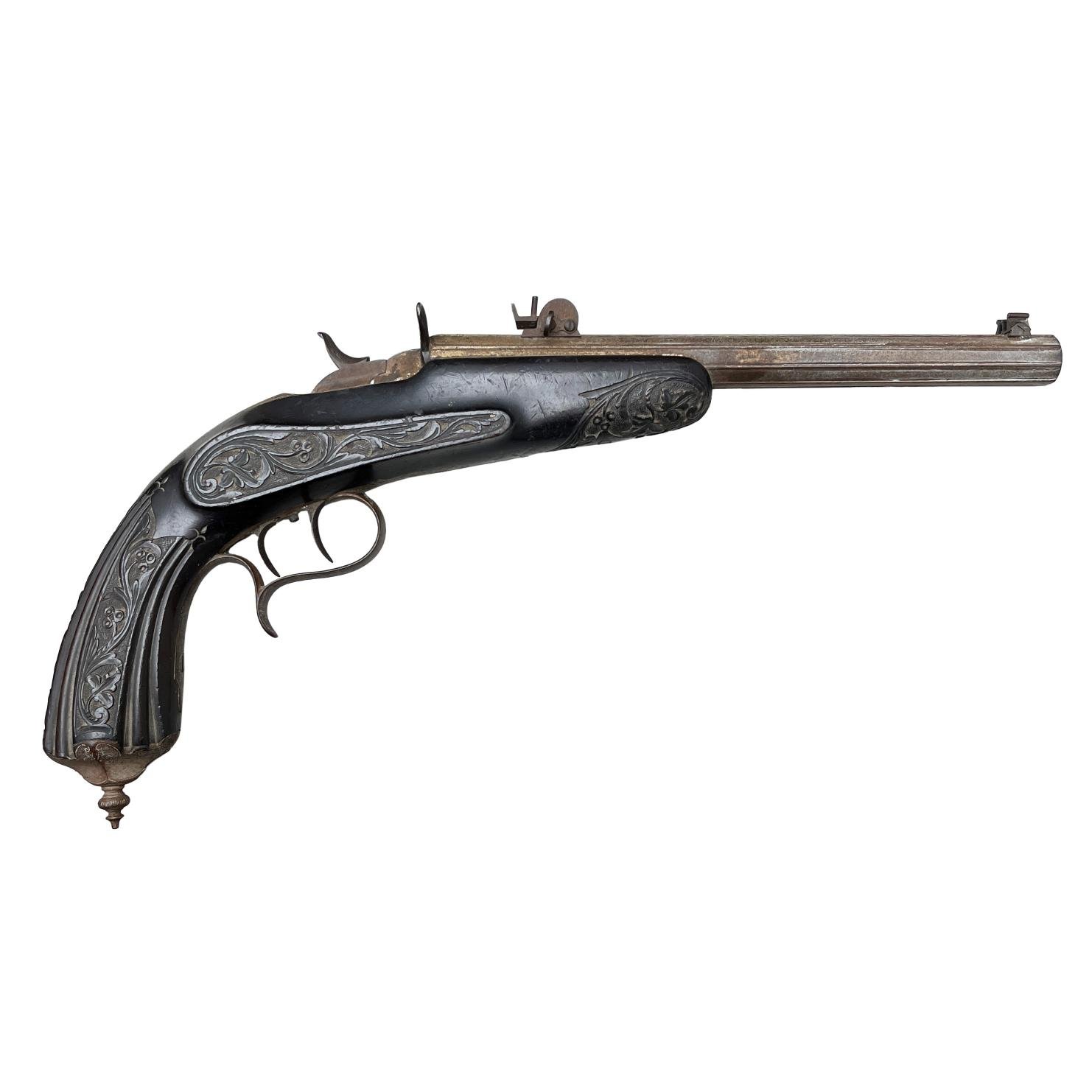 Par de pistolas belgas para tiro de salón, calibre 8 mm Flobert. Punzón «Sol» de armería Broqua & Scholberg. Empuñadura en madera de ébano tallada, con guarniciones en metal cincelado «arabescos». Mira regulable, gatillo al pelo. Largo 41 cm. Funcionando. Este tipo de pistolas se utilizaba también para practicar tiro en la modalidad «duelo».