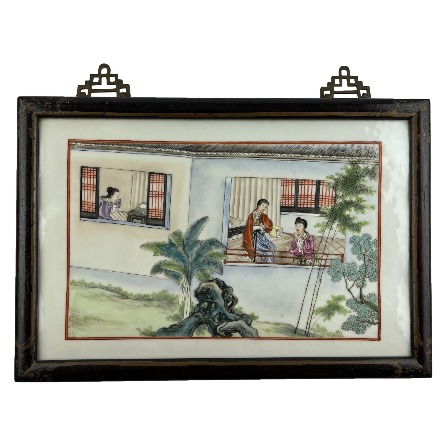 Par de placas chinas en porcelana familia rosa pintada a mano «escenas típicas». 18 x 25 cm. Marcos en madera tallada con ganchos en bronce calado.