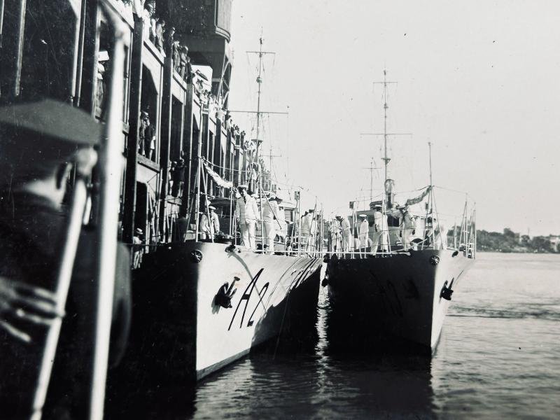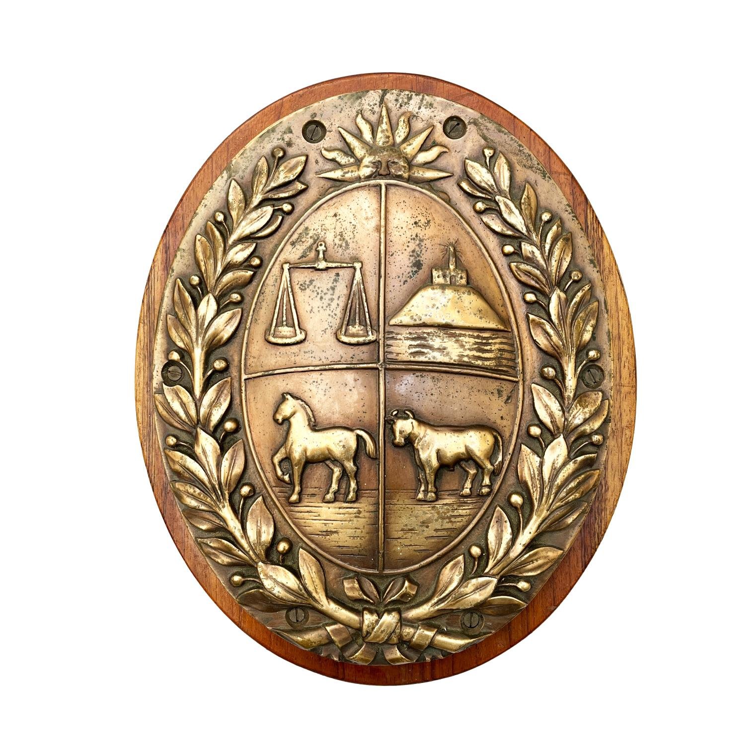 Par de placas en bronce: «Sol de Mayo» y “Escudo de armas uruguayo”. Diámetros 28 y 34 cm. Piezas pertenecientes a uno de los tres buques patrulleros guardacostas fabricados en Italia para la Marina Nacional del Uruguay: «ROU Paysandú», «ROU Salto» y «ROU Río Negro». Presentados sobre peanas en madera. Estas naves arribaron al puerto de Montevideo en 1936, luego de navegar más de 8.000 millas con tripulación uruguaya cruzando el Mar Mediterráneo y el Océano Atlántico. Colección Capitán de Navío Eduardo Nosei.
