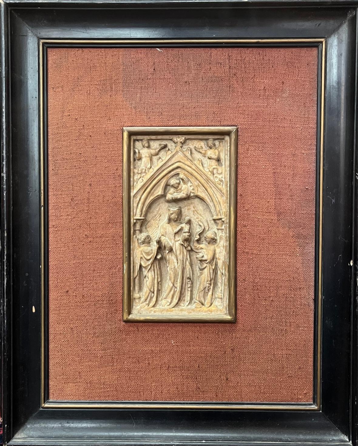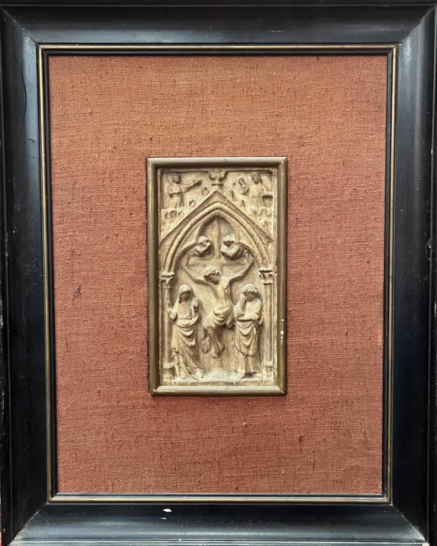 Par de placas italianas en yeso patinado, en estilo neogótico. «Crucifixión» y «Virgen con niño y ángeles.» 17 x 9 cm. Enmarcadas.