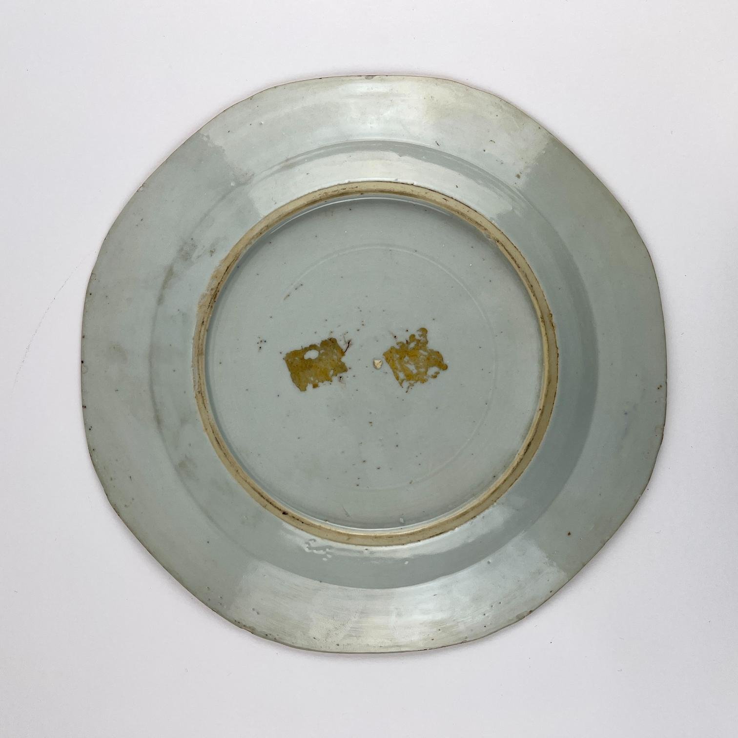 Plato octogonal chino en porcelana Compañía de Indias s. XVIII, período Qianlong, decorado «paisaje y pagoda» en paleta Imari. Diámetro 22.5 cm.