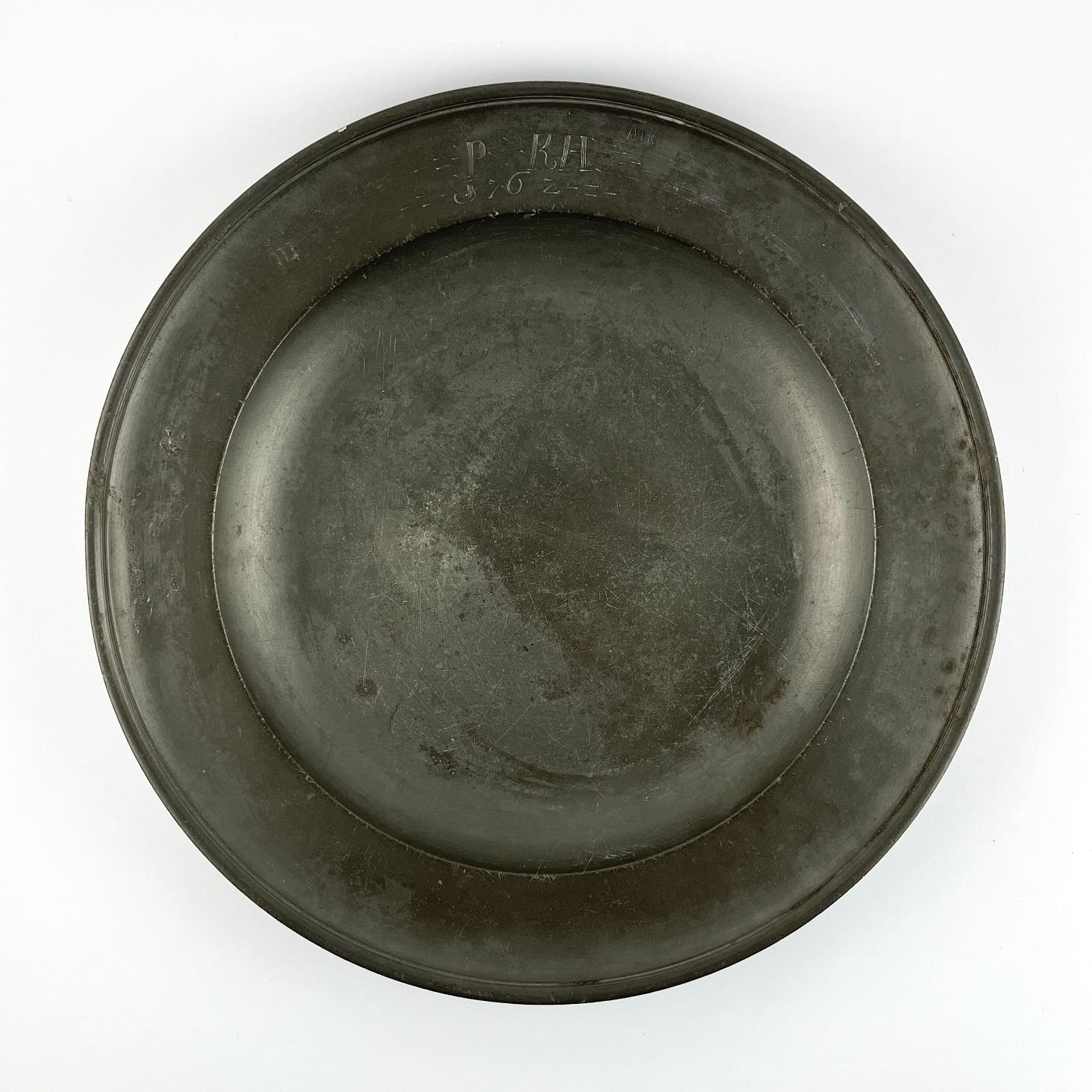 Par de platos en peltre liso, s. XVIII, uno de ellos grabado con iniciales «P.K.H.» y fechado «1762». Diámetro 31.5 cm.