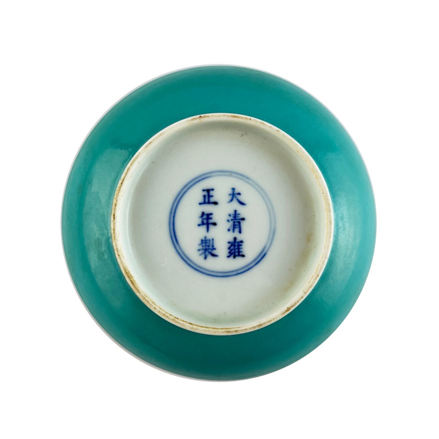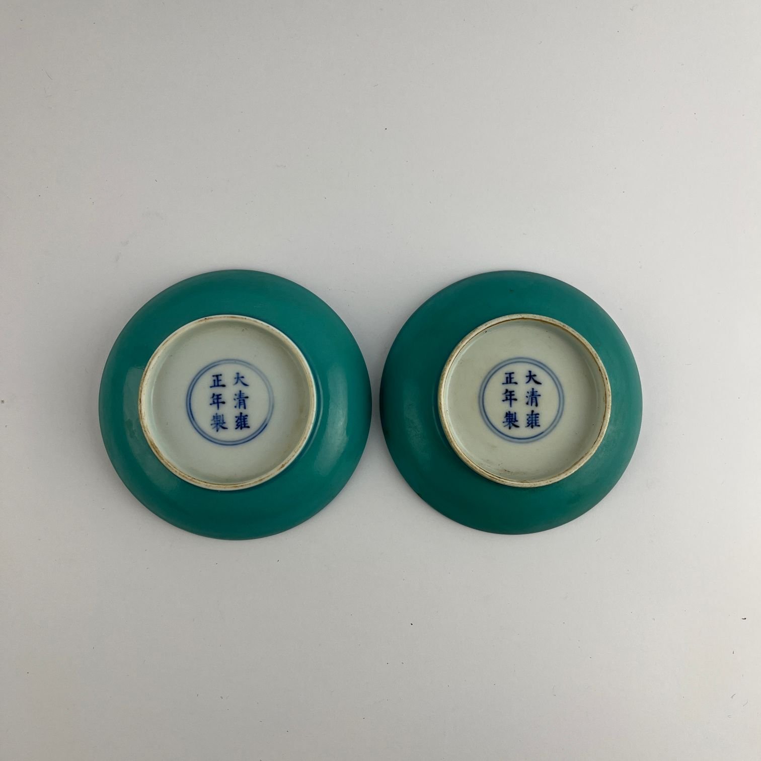 Par de pequeños platos chinos en porcelana esmaltada en color turquesa. Base con doble círculo y símbolos del emperador Yongzheng. 2.8 x 11.5 cm