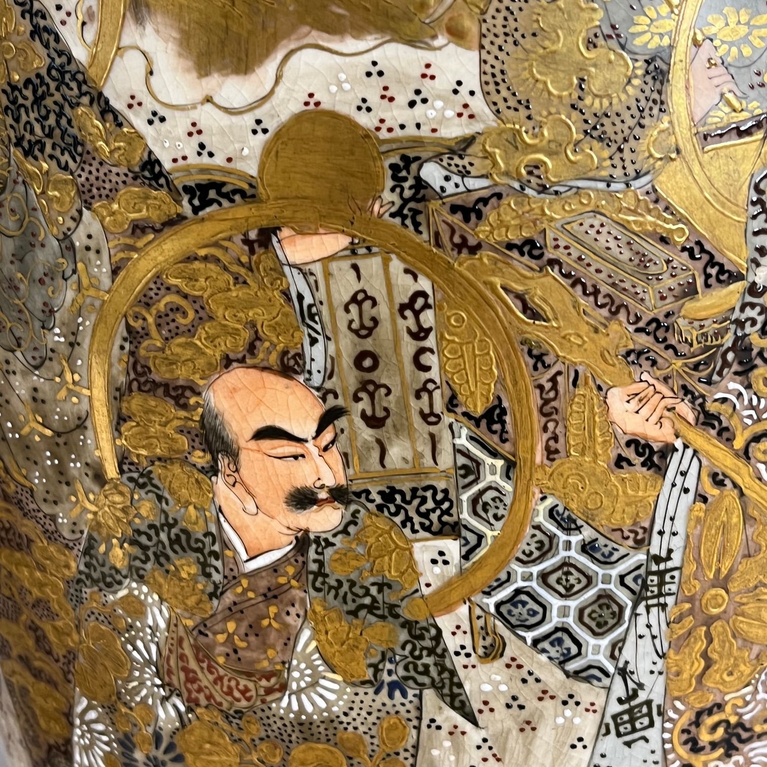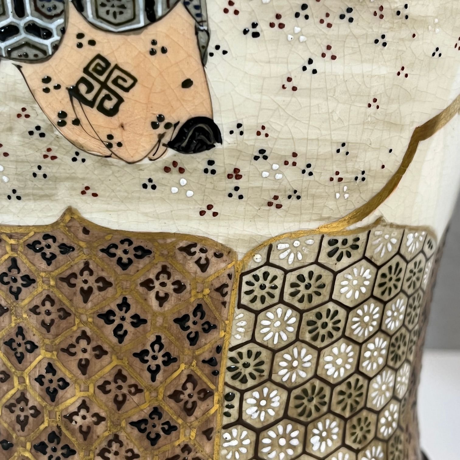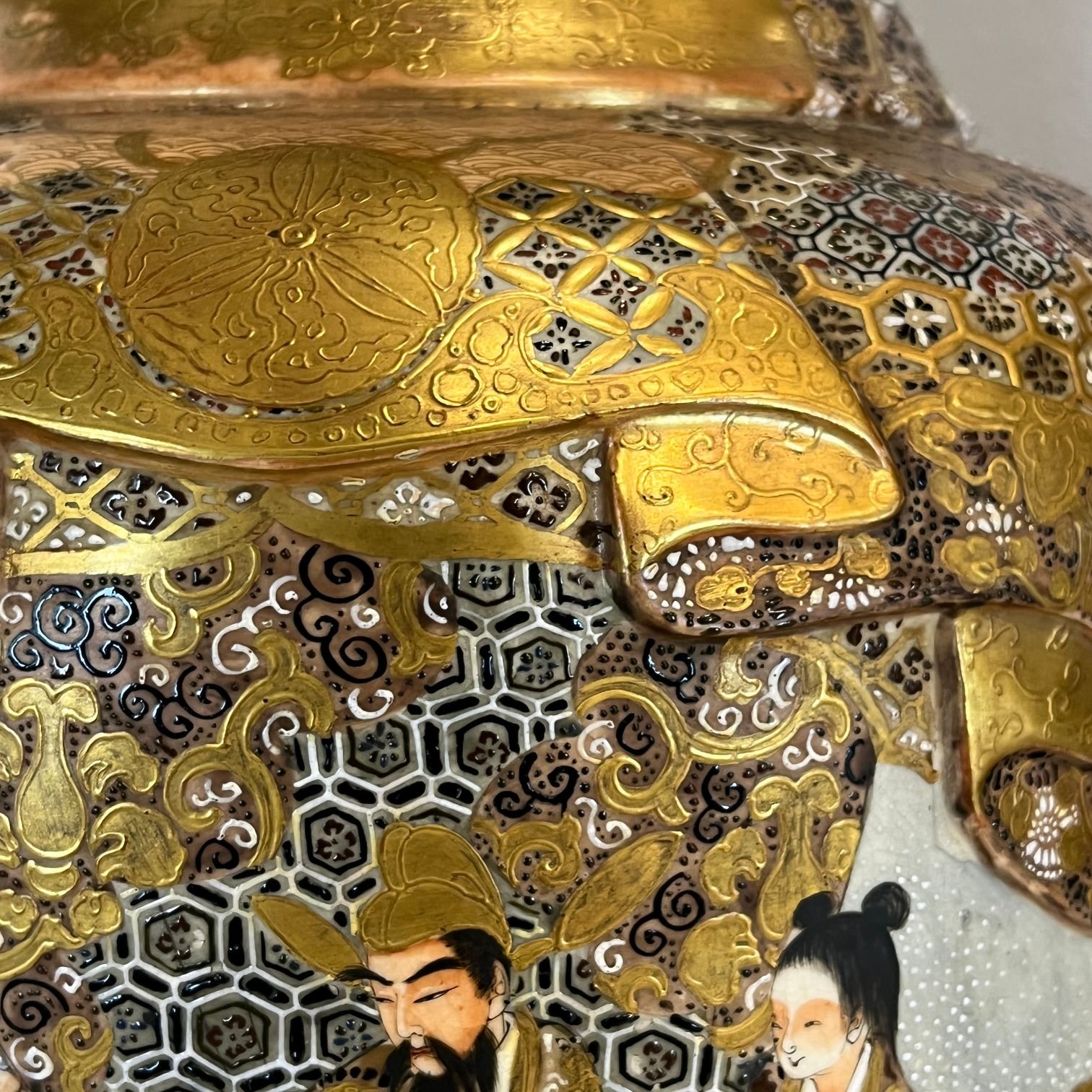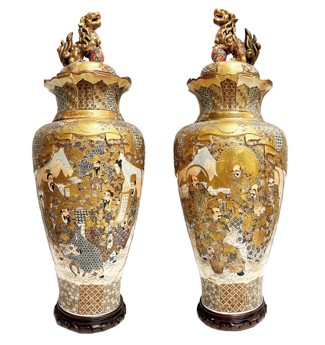 Par de potiches japoneses en porcelana Satsuma “Mil Caras”. Bocas en ondas, restauradas. Tapas esculturadas «perros de Fo», una restaurada. 65 x 25 cm. Bases en madera tallada y calada. Alto total 70 cm.