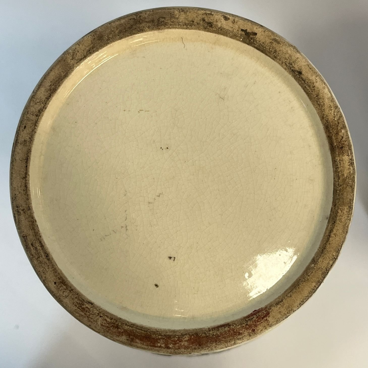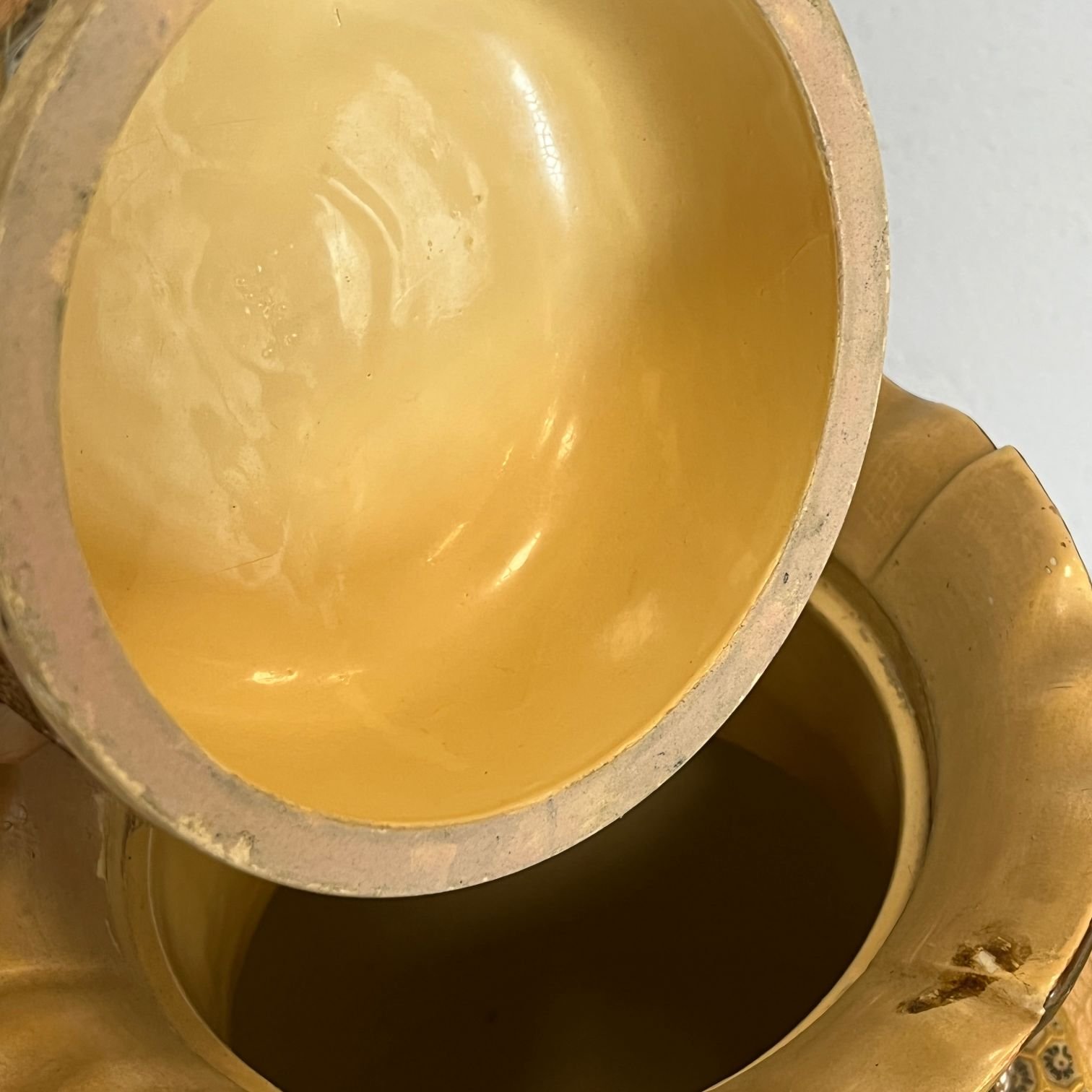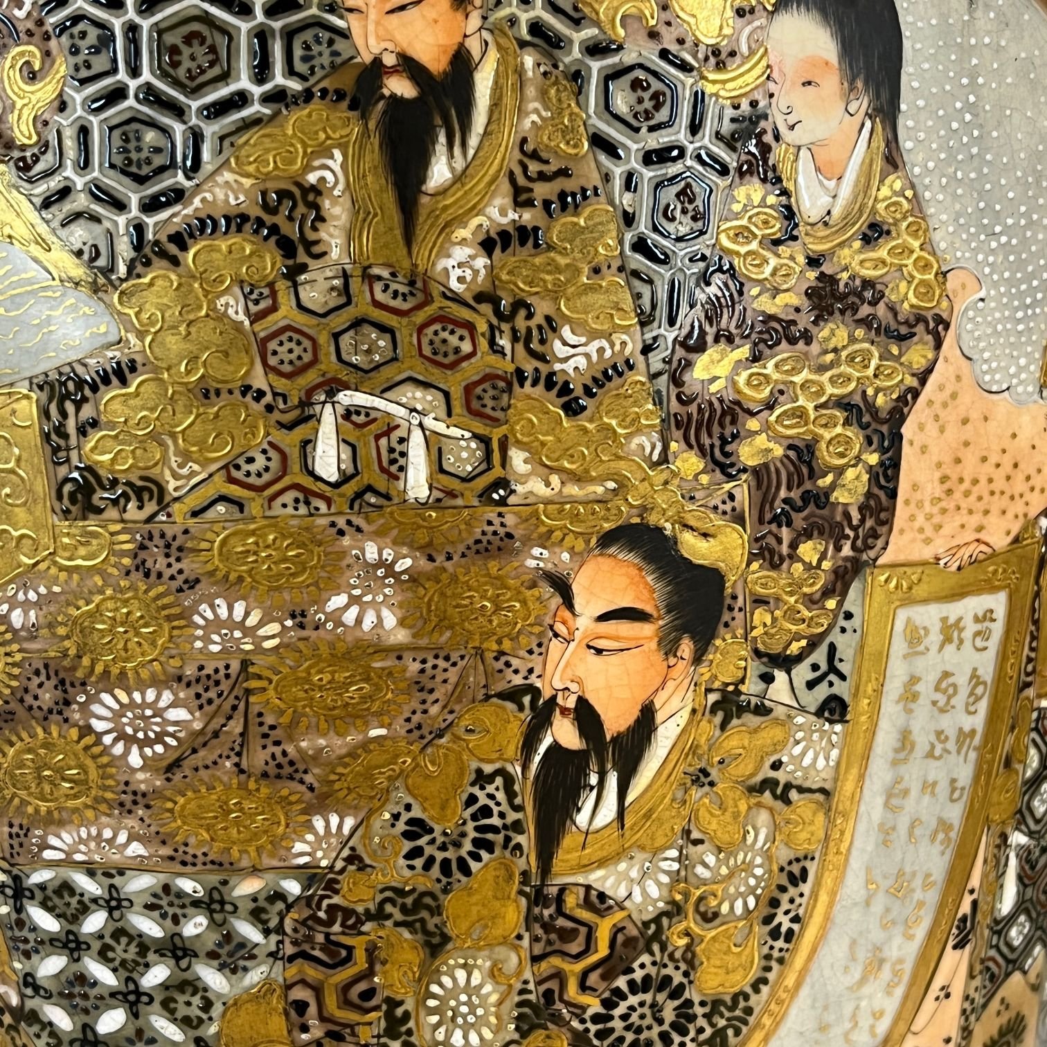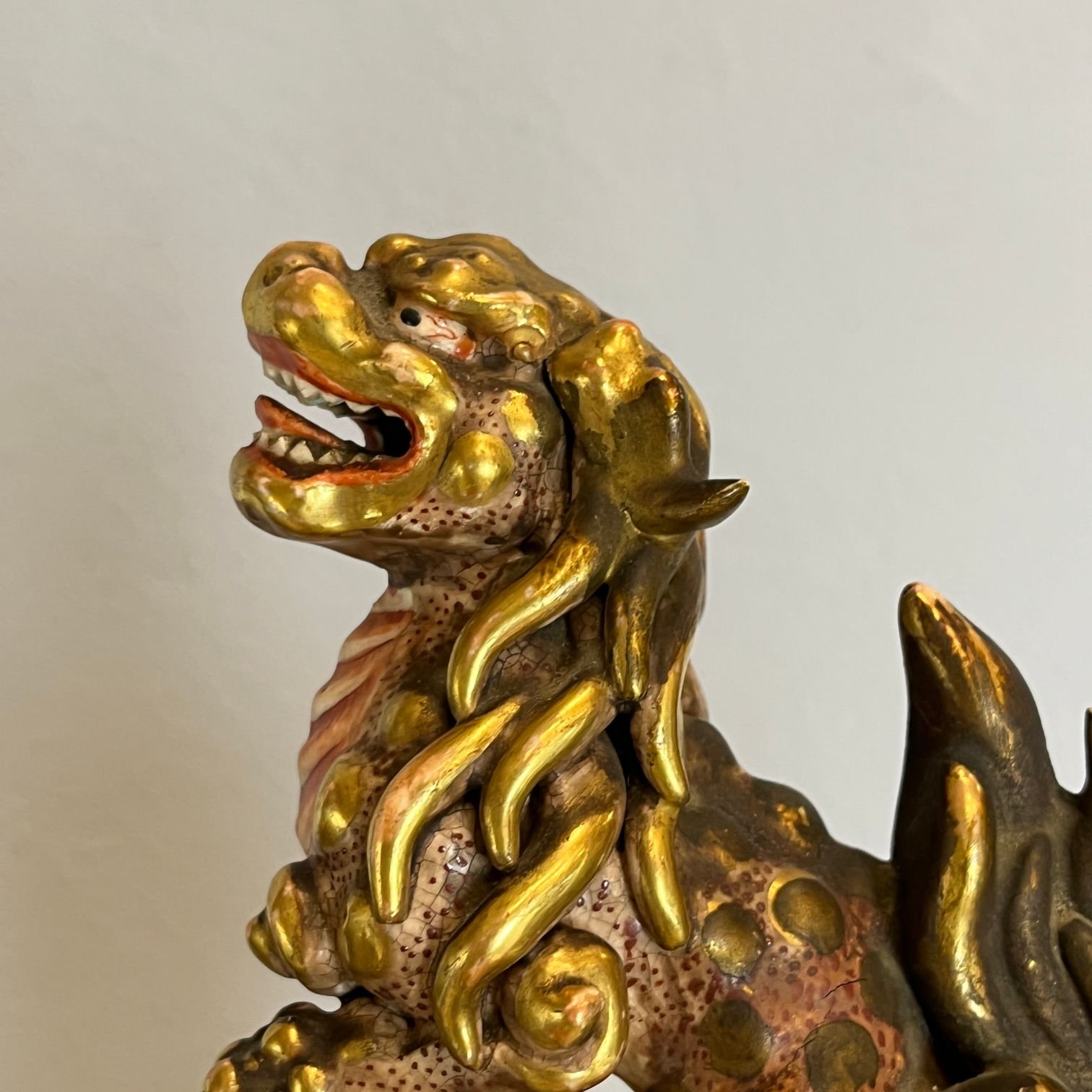 Par de potiches japoneses en porcelana Satsuma “Mil Caras”. Bocas en ondas, restauradas. Tapas esculturadas «perros de Fo», una restaurada. 65 x 25 cm. Bases en madera tallada y calada. Alto total 70 cm.