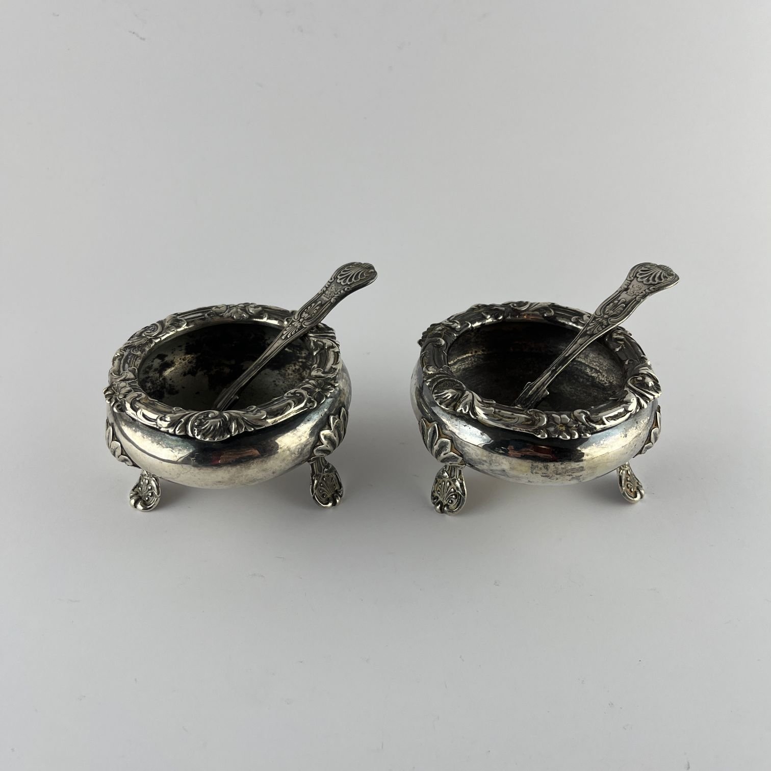 Par de saleros ingleses en plata de Londres año 1855, con borde cincelado «hojas y flores» y tres patas esculturadas «valvas», con punzón del platero William Sumner. 5 x 9 cm. Acompañado por par de cucharitas en plata de Londres año 1839, con punzón de los plateros John & Henry Lias, cinceladas «valvas». Peso total 350 gr.