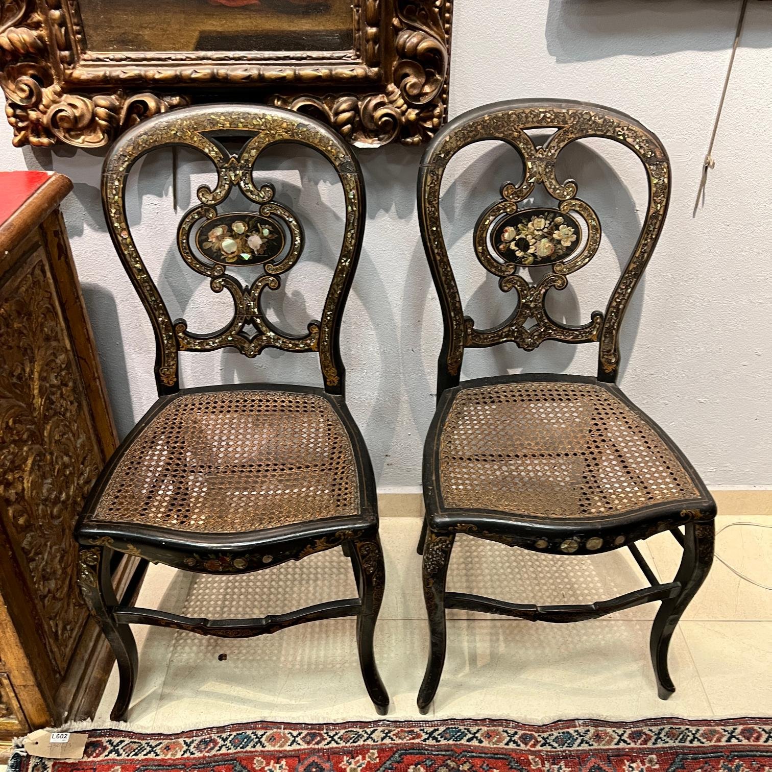 Par de sillas estilo Napoleón III en madera ebanizada totalmente decorada con incrustaciones en madreperla y detalles en dorado, con asientos esterillados. Pequeñas averías y faltantes.