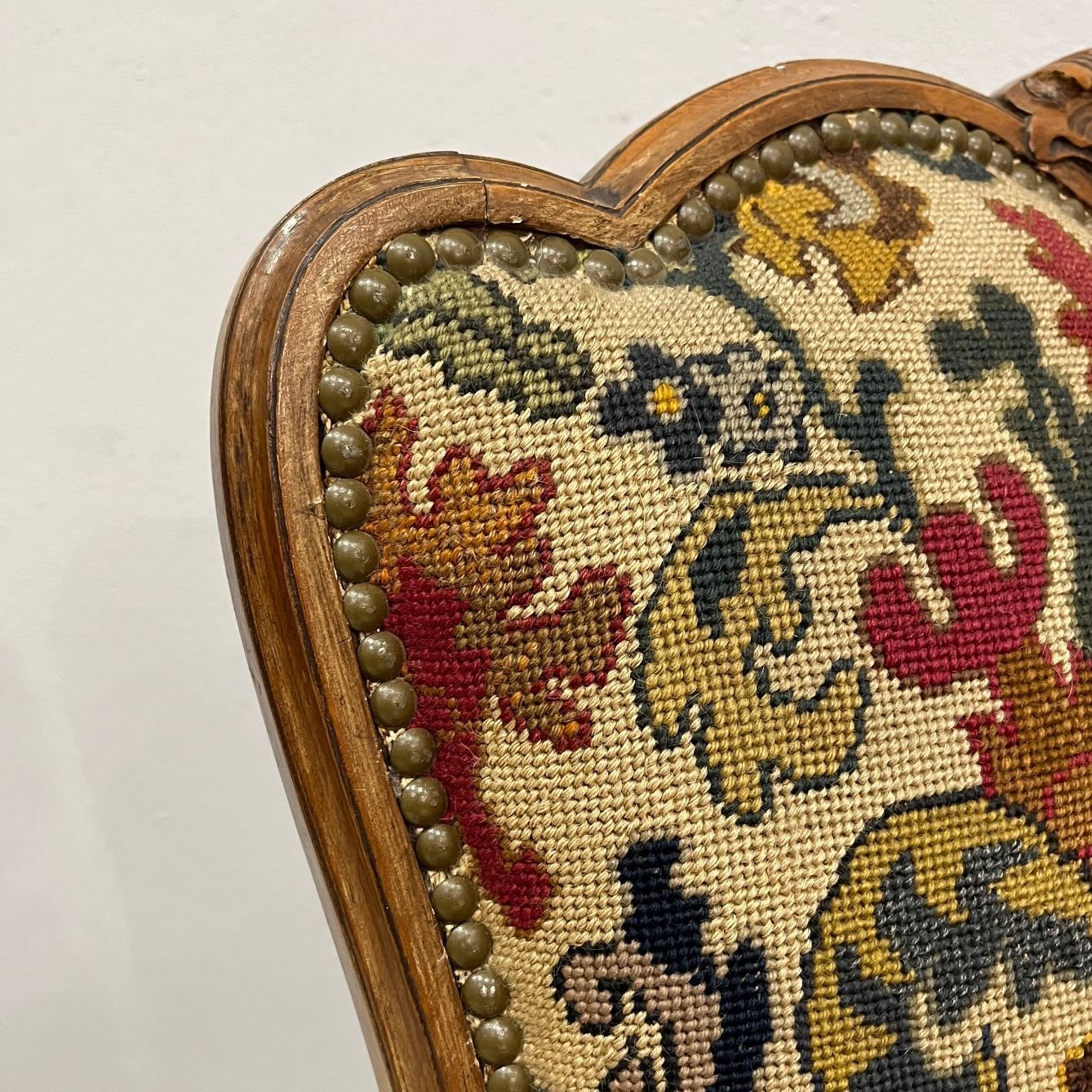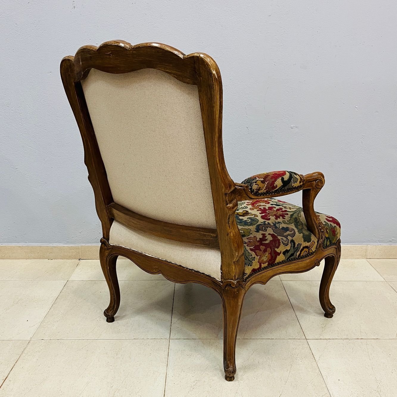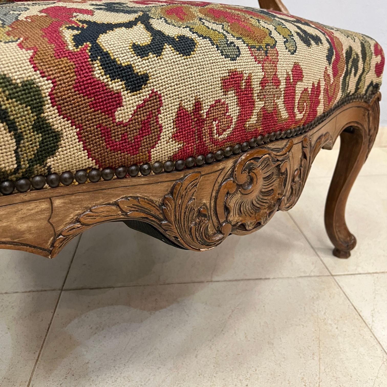 Par de sillones estilo Luis XV en madera de haya con asientos, respaldos y apoyabrazos tapizados en gros point decorado «flores».