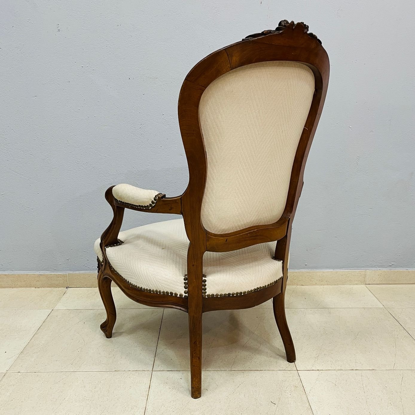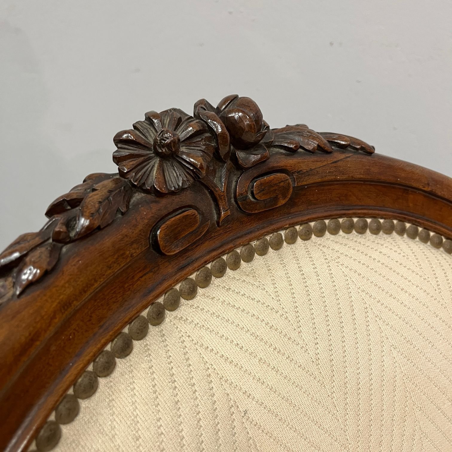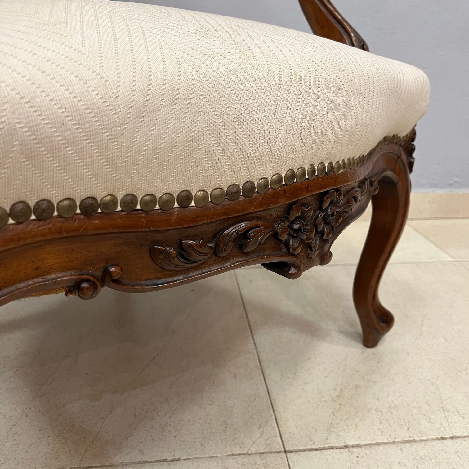 Par de sillones ingleses estilo victoriano en madera de caoba con asientos, respaldos y apoyabrazos tapizados en color blanco. Presentan tiros de polilla.