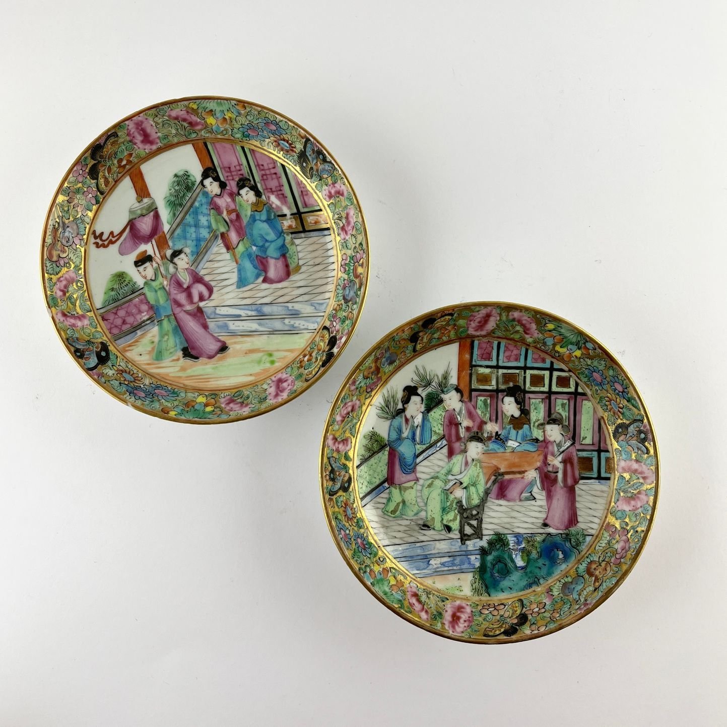 Par de tazas chinas para café en porcelana Cantón, con sus platillos.