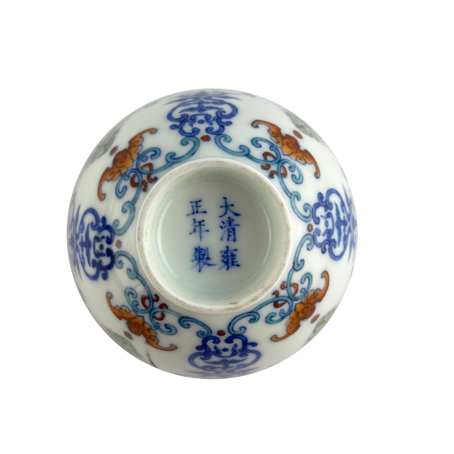 Par de tazas de té chinas en porcelana polícroma decorada “murciélagos”. Base con símbolos del emperador Yongzheng. 6 x 10 cm.