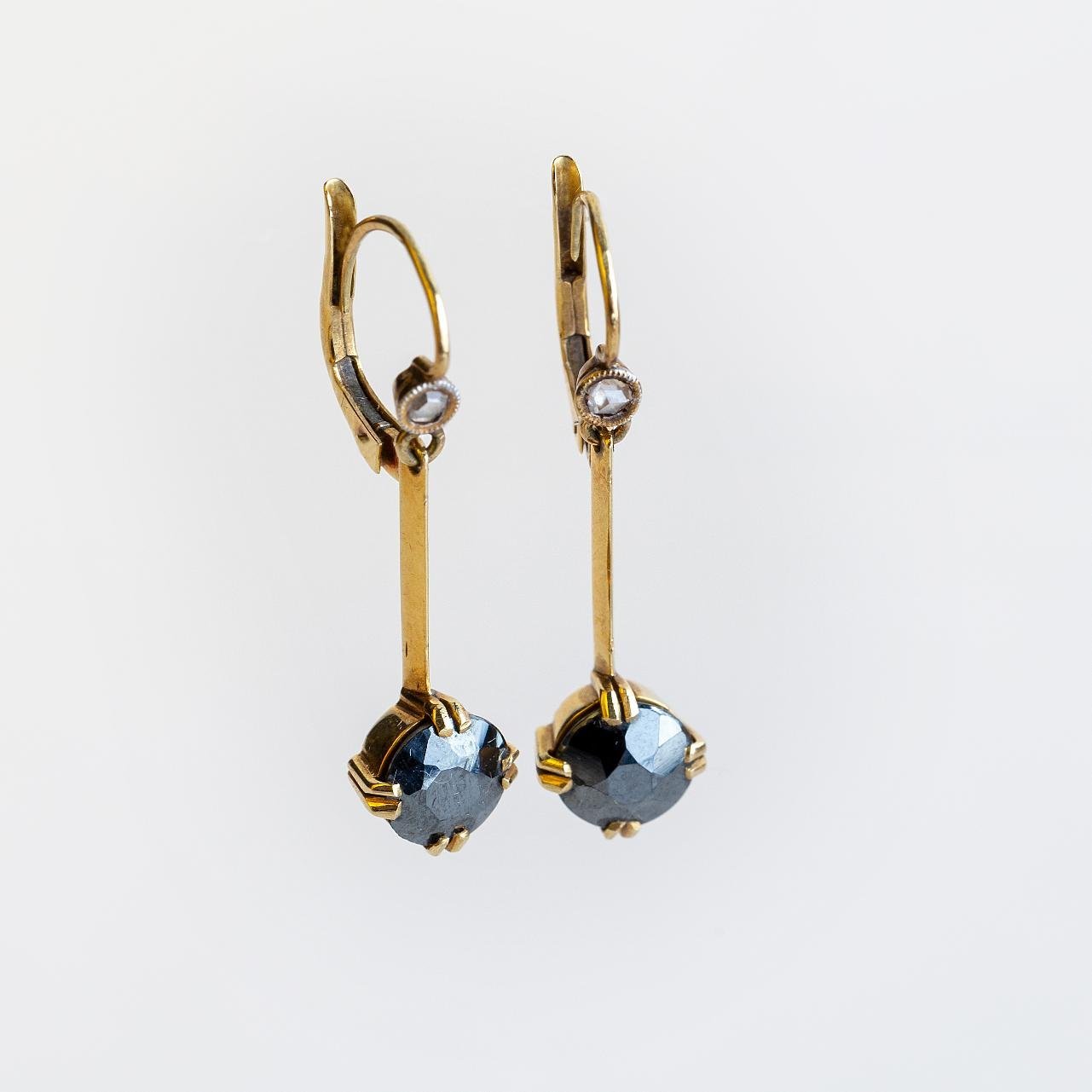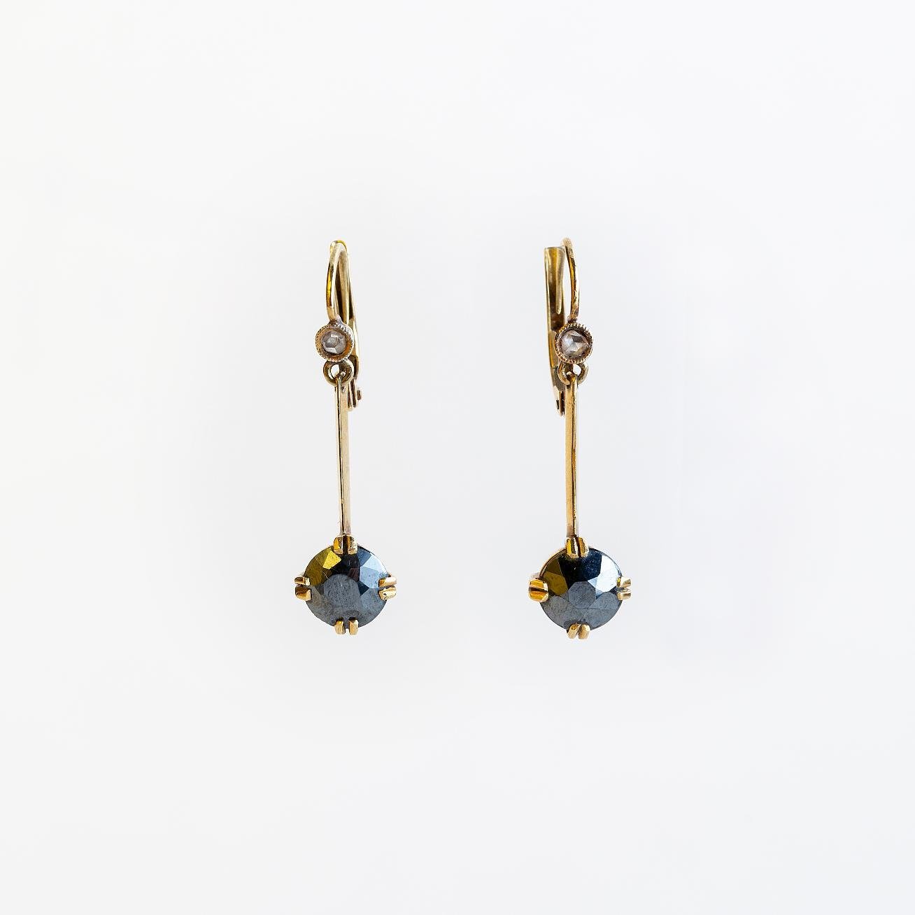 Par de caravanas en oro amarillo con una hematita central y un diamante en cada una.