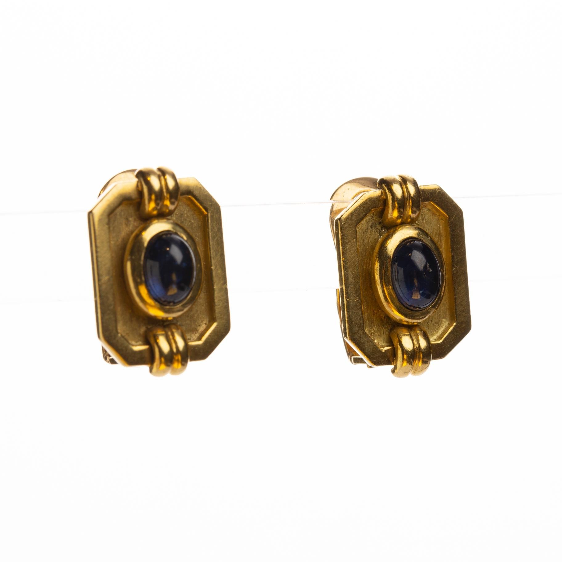 Par de caravanas tipo clip en oro 18 K amarillo con un zafiro talla cabujón en cada uno. 22,5 x 15 mm. Peso bruto 19,4 gr.