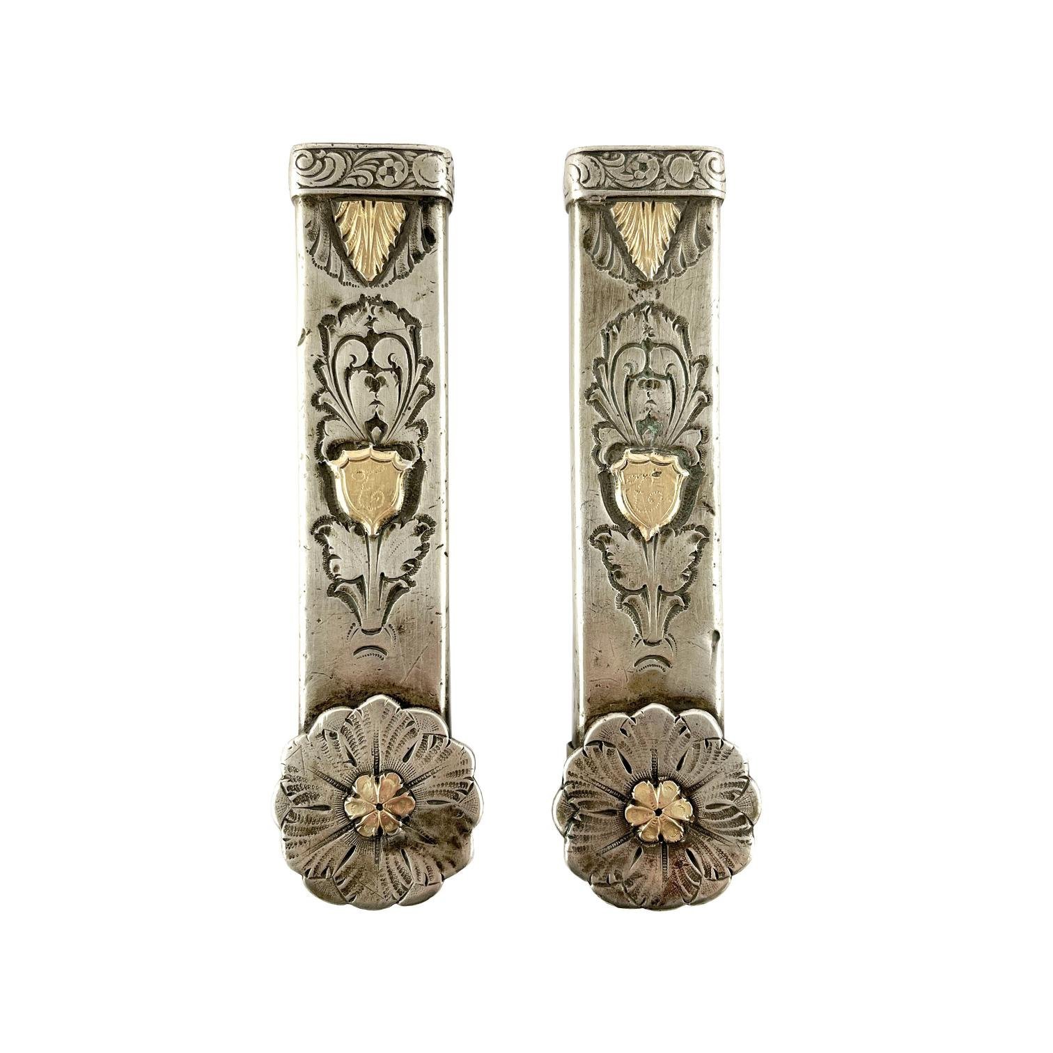 Par de pasadores chatos de estribera en plata y oro cincelados «hojas y flores». Largo 14 cm.