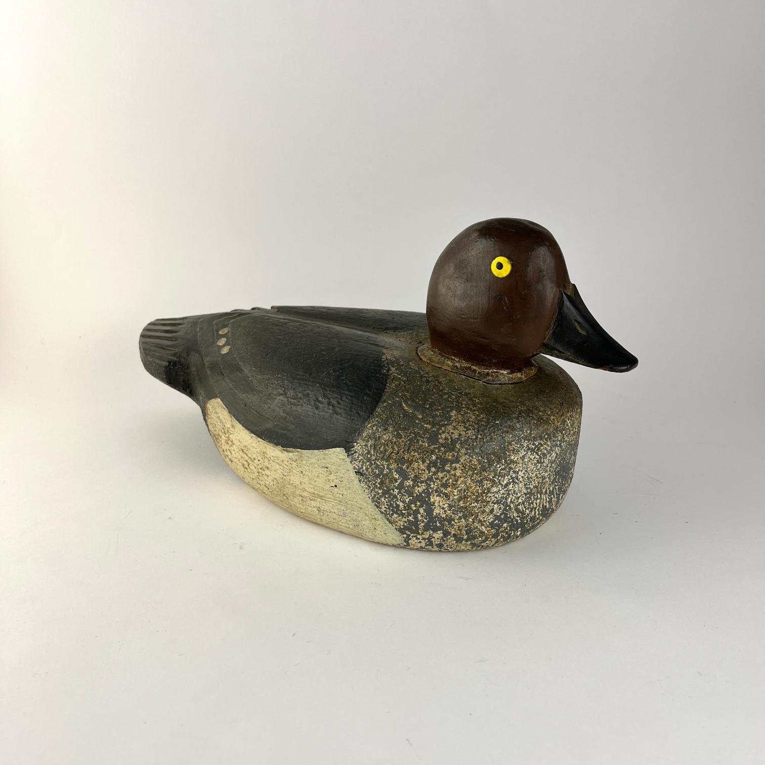 Pato señuelo de cacería en madera policromada. 15 x 34 x 15 cm.