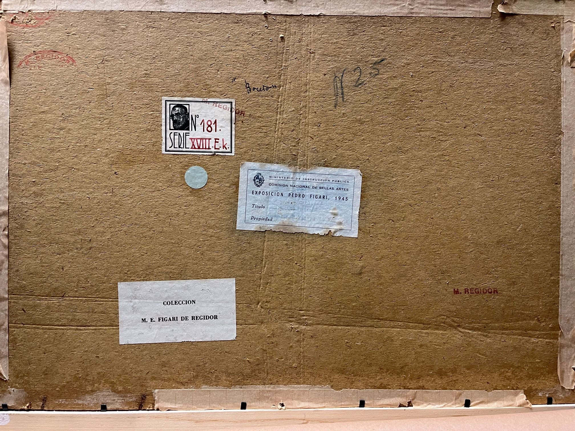 Al dorso etiqueta del inventario del Arq. Herrera McLean, No. 181 Serie XVIII.E.K, sello húmedo de la colección M. Regidor y etiqueta impresa de la colección M. E. Figari de Regidor.