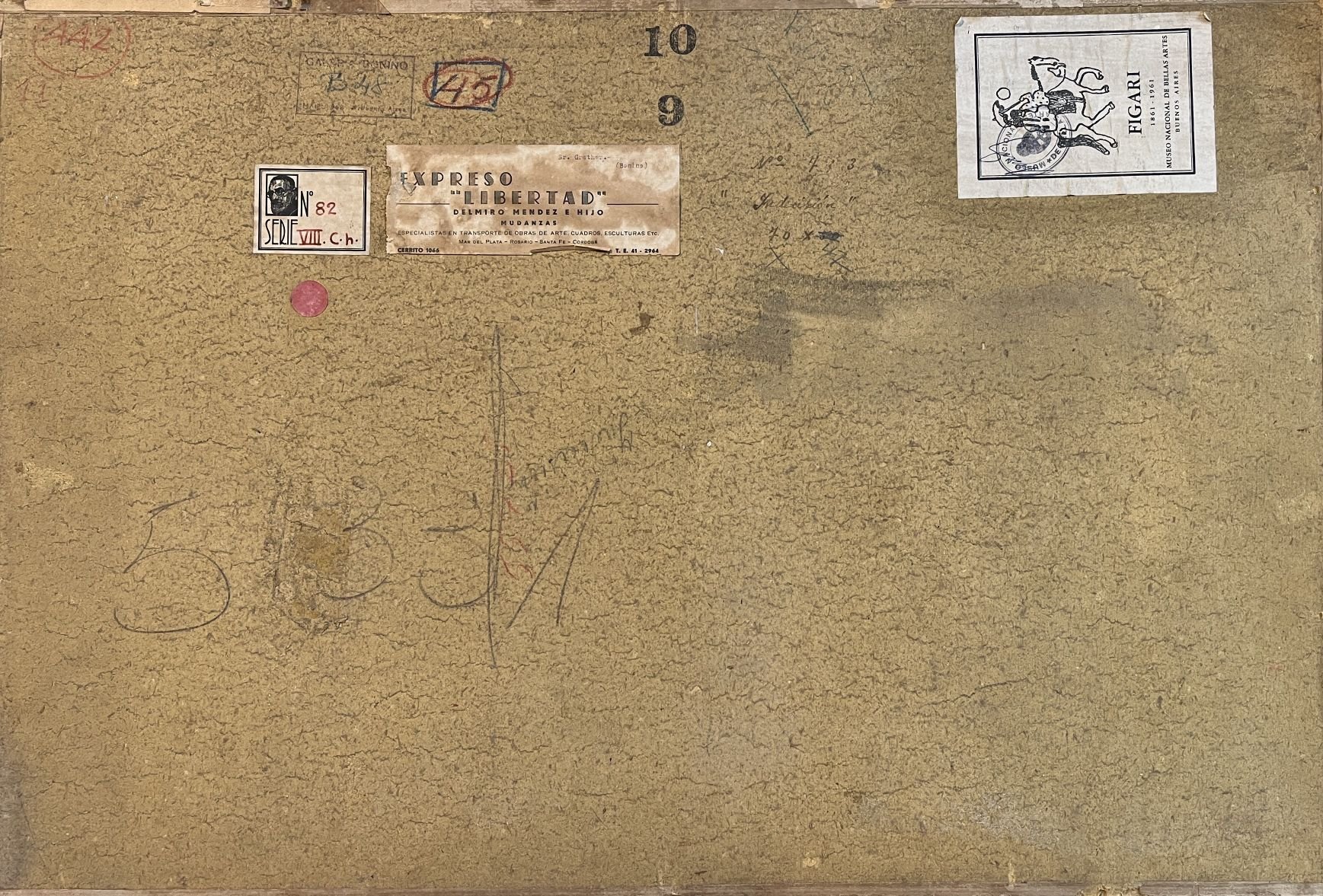 «Pedro Figari.» Comisión Nacional de Bellas Artes del Ministerio de Instrucción Pública. Montevideo, 1945, con etiqueta correspondiente al dorso.