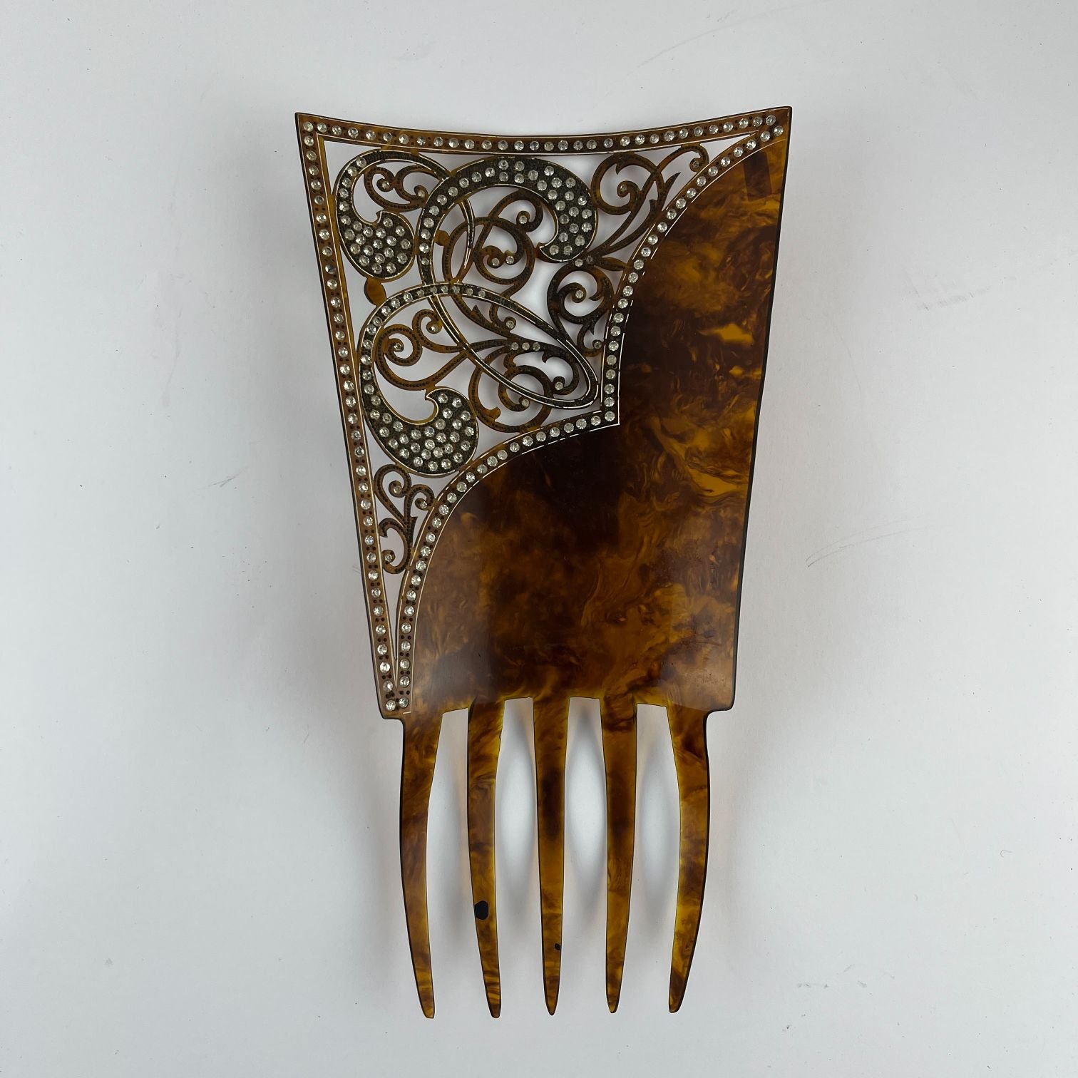 Peinetón en celuloide calado y cincelado «hojas», decorado con zirconias. 28 x 15.5 cm.