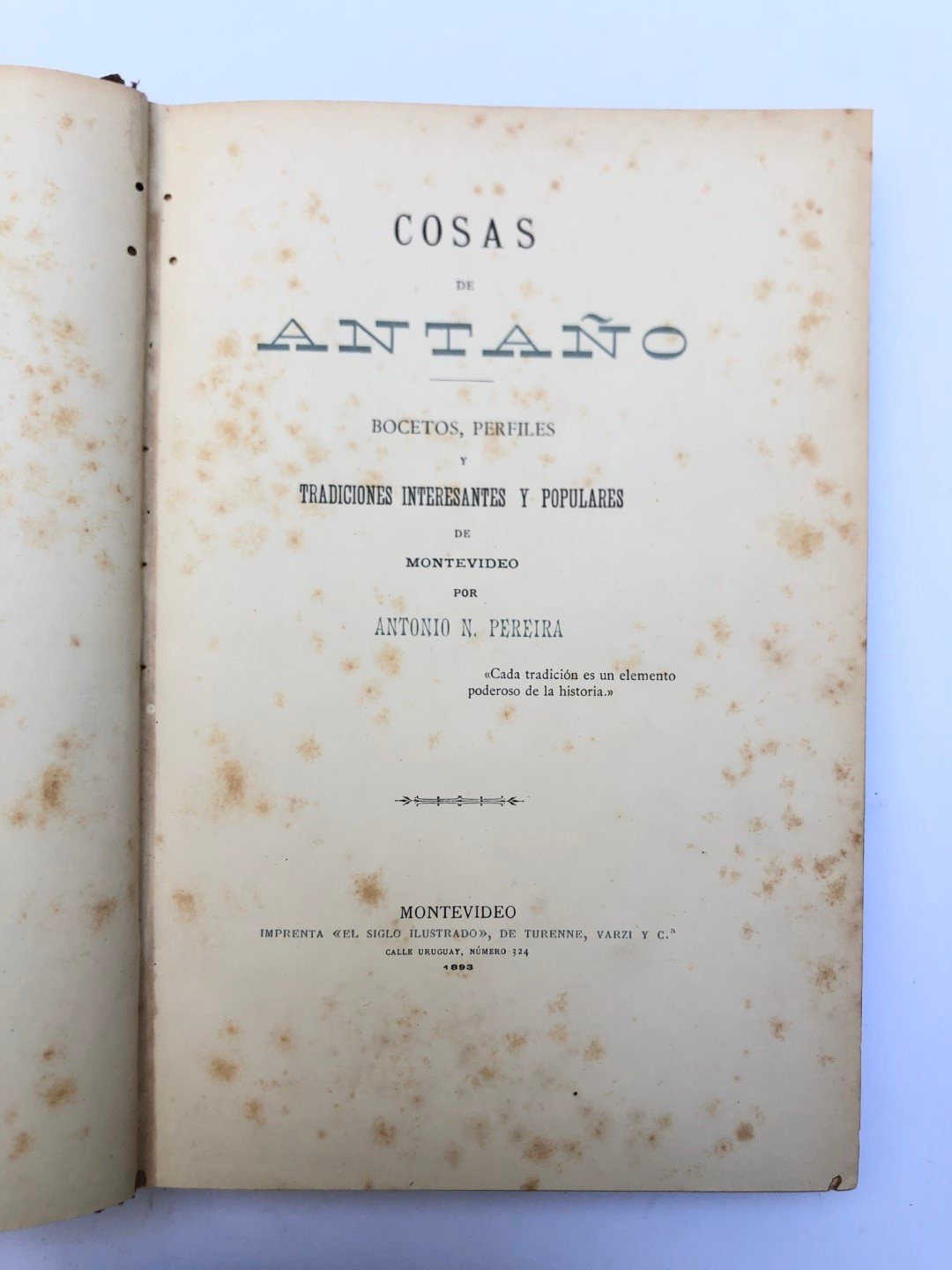 PEREIRA, Antonio: Cosas de antaño. Bocetos, perfiles y tradiciones interesantes y populares de Montevideo. Montevideo, Imprenta El Siglo Ilustrado. 1893.