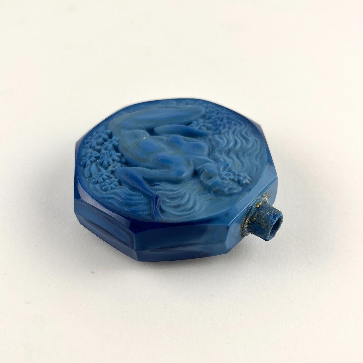 Perfumero octogonal art decó en pasta de vidrio azul y celeste decorada «desnudo femenino hojas y flores». Diámetro 6 cm. Falta tapa