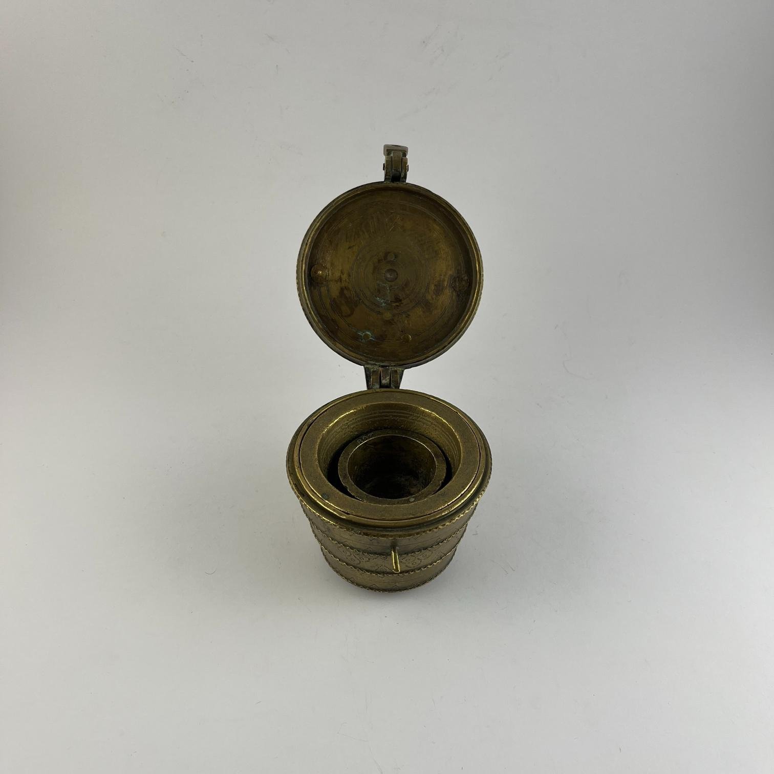 Ponderal de vasos anidados, en bronce. Alto máximo 15 cm.