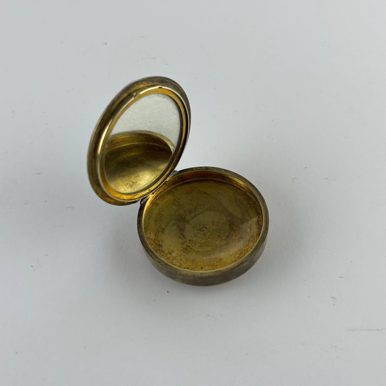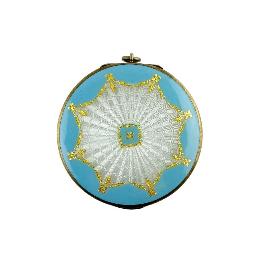 Petaca colgante en plata Sterling vermeil. Tapa esmaltada en colores celeste y gris con detalles en oro. Diámetro 4.3 cm.