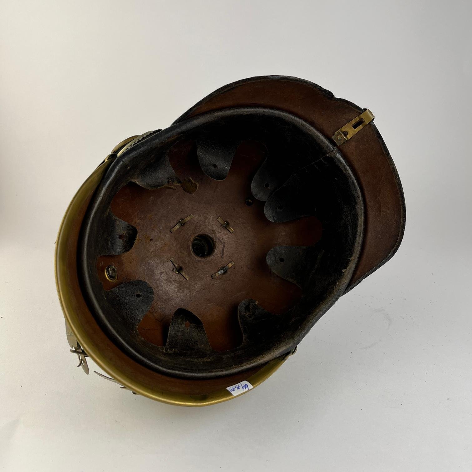 Casco pickelhaube prusiano para oficial del ducado de Anhalt, en cuero y bronce. Insignia frontal y carrilleras escamadas. Interior completo.