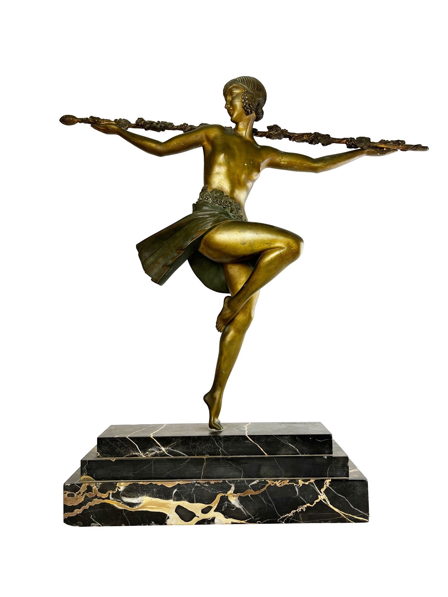 PIERRE LE FAGUAYS (escuela francesa, 1892-1962). Escultura art decó en bronce policromado sobre peana en mármol negro veteado. «Bailarina con tirso.» Firmada en la peana por el artista y por la fundición Etling, París. 56 x 59 x 10 cm.