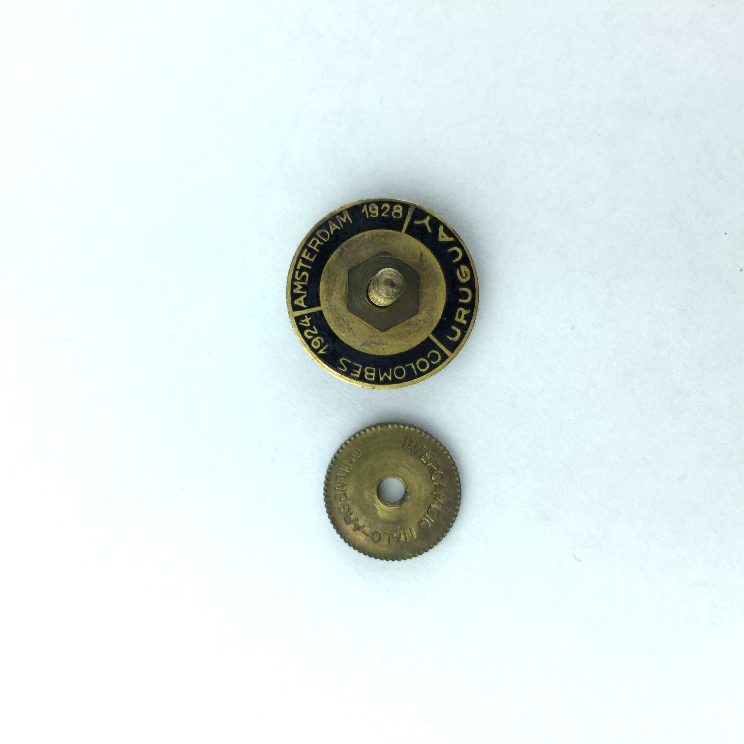 Pin en bronce esmaltado conmemorativo de los triunfos de las selecciones uruguayas campeonas de los Juegos Olímpicos de 1924 y 1928 y el Campeonato Mundial de Fútbol de 1930.