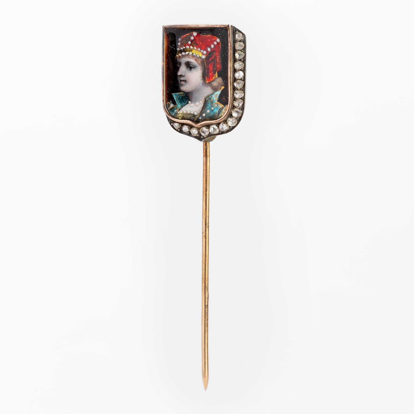 Pincho para corbata en oro amarillo con placa en esmalte decorada «dama», con dieciséis diamantes, firmado con inicial «A». Peso bruto 5.5 gr.