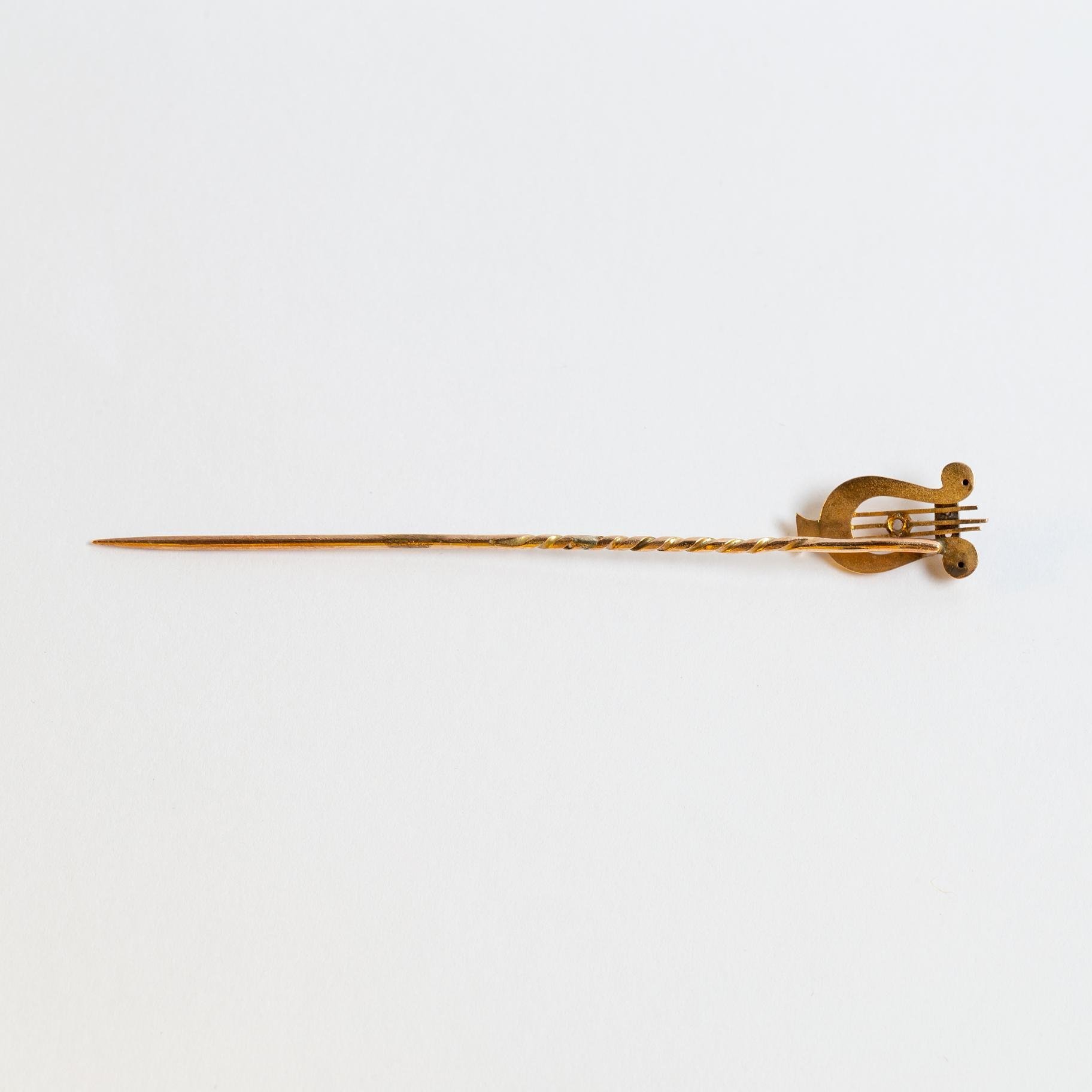 Pincho para corbata en oro amarillo esculturado “lira”, con tres diamantes. Peso bruto 1.4 gr.
