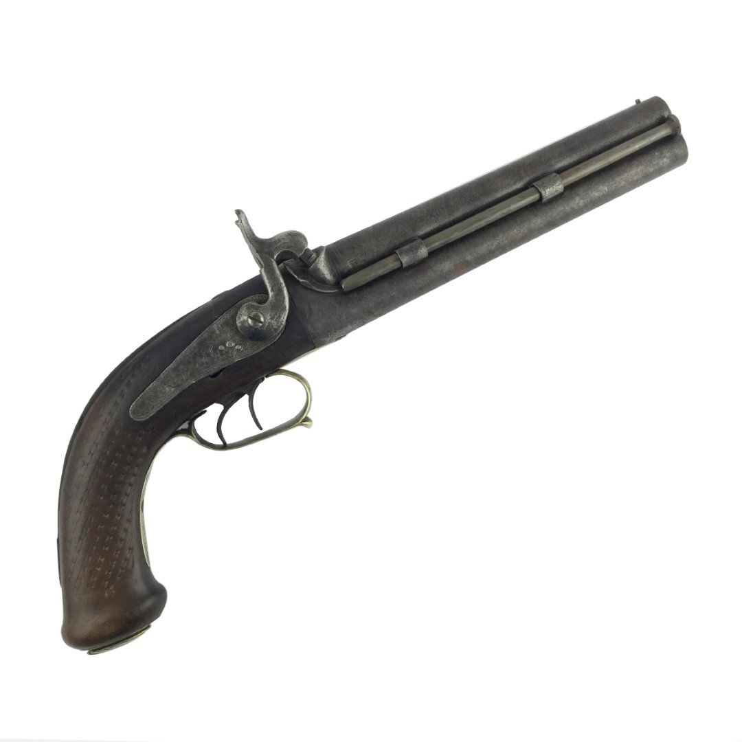 Pistola belga de avancarga sistema de percusión. Dos caños superpuestos. Platinas cinceladas arabescos. Empuñadura en madera tallada. Guardamonte y pomola portafulminantes en alpaca cincelada. Baqueta en hierro. Funcionando. Largo total 38 cm.