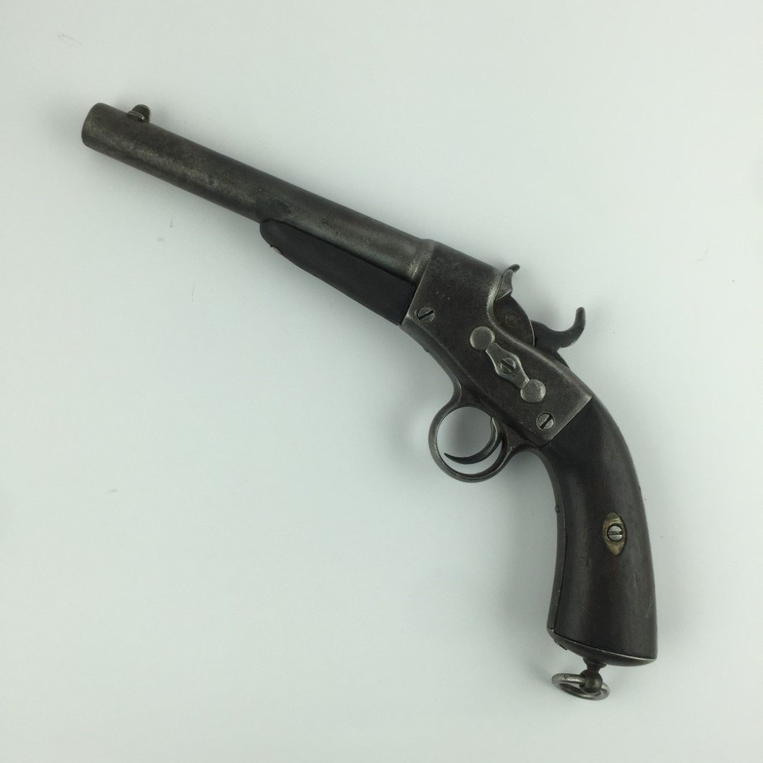Pistola belga sistema Rolling Block calibre 500. Chimaza y cachas en madera lisa. Funcionando.