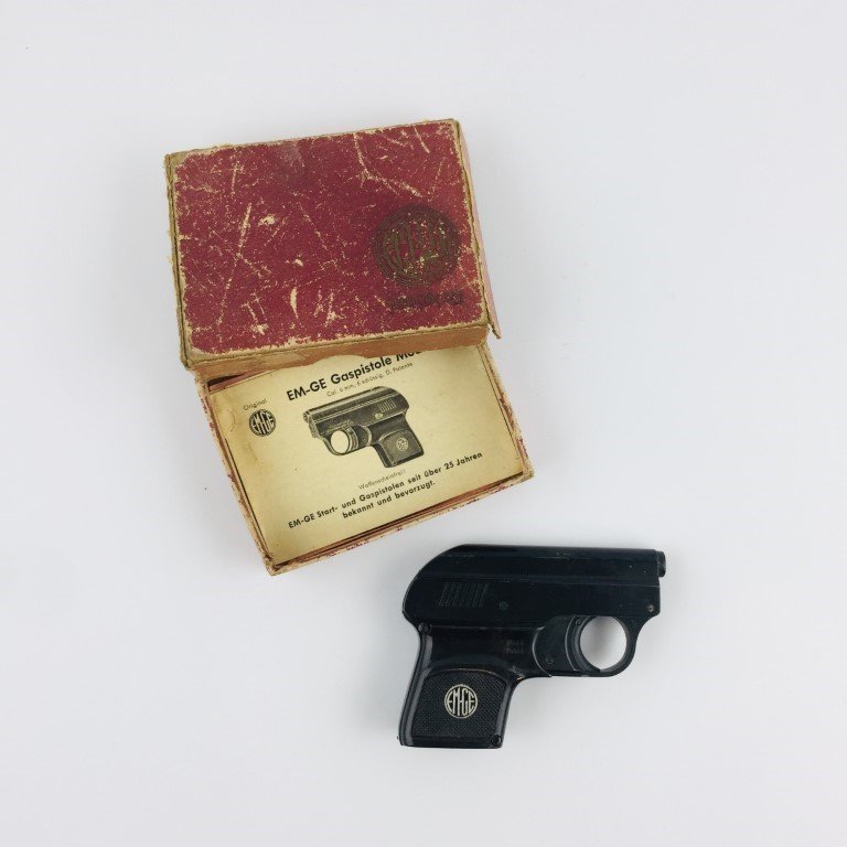 Pistola alemana lanzagases. Fabricada por EM-GE, modelo 6A. En caja original con manual.