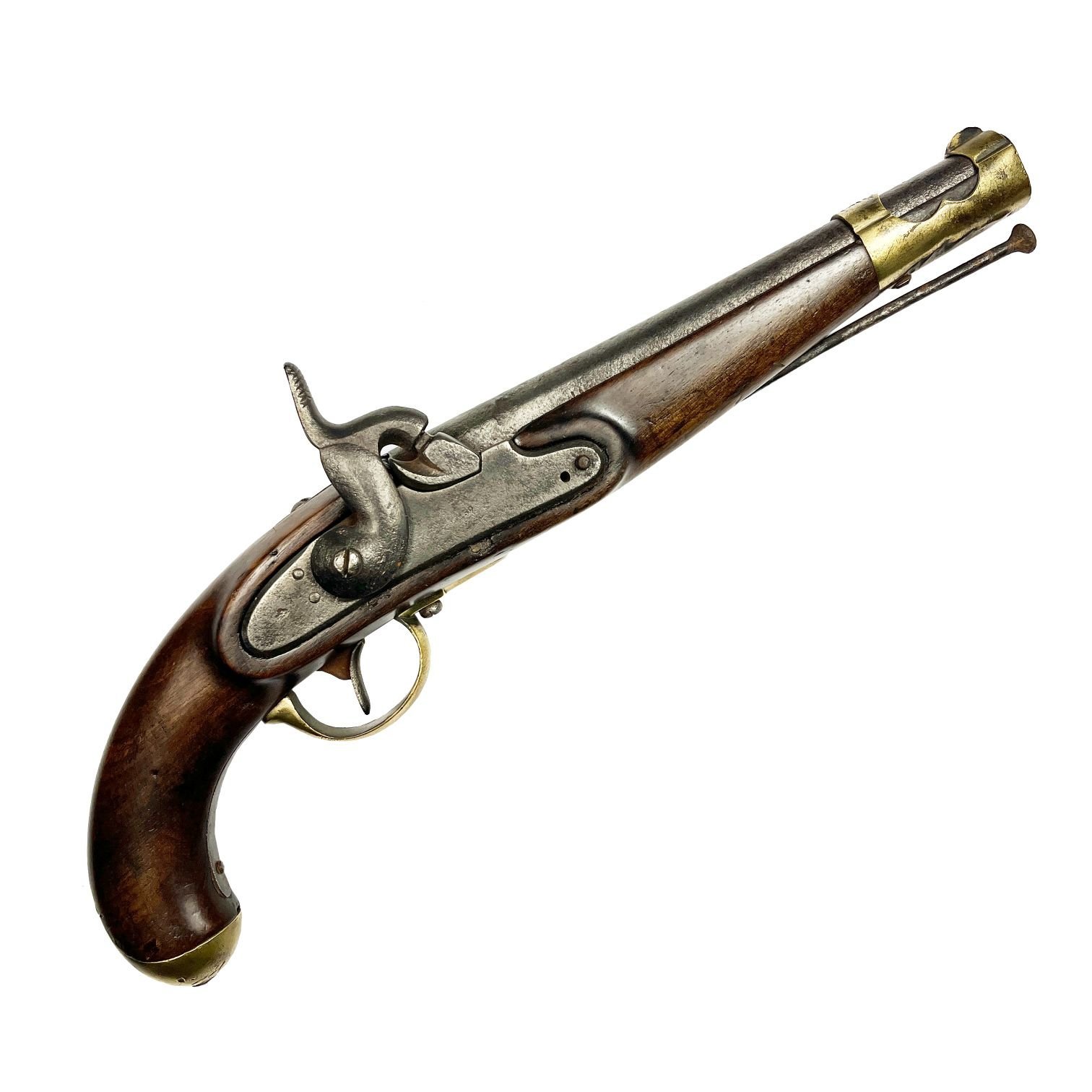 Pistola austríaca de caballería, de avancarga sistema de percusión. Abrazadera, guardamonte y pomo en bronce. Baqueta en hierro. No funciona.
