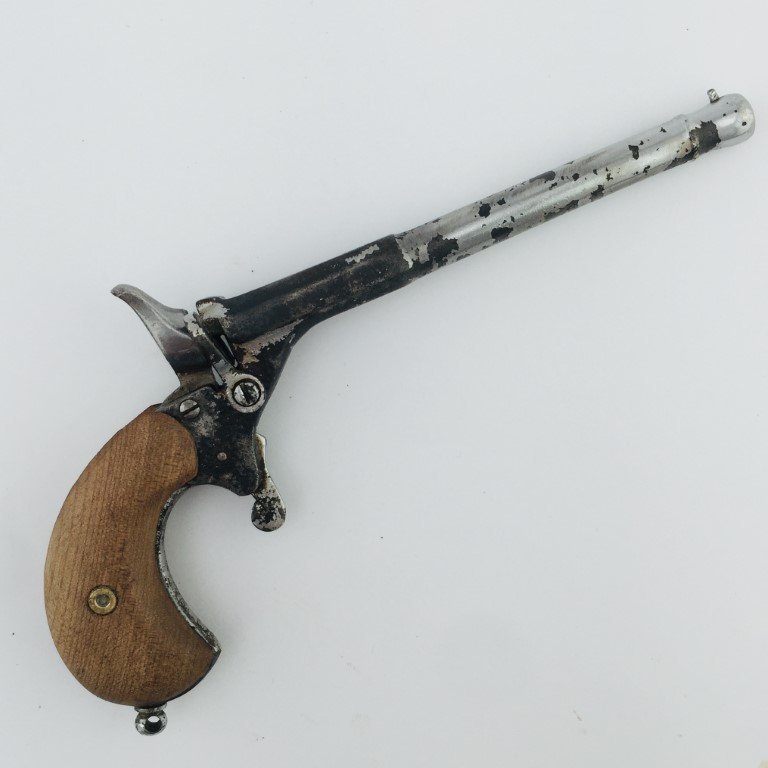 Pistola belga tipo matagatos calibre 6 mm Flobert, niquelada. Sección de caño hexagonal. Cachas en madera lisa. Largo total 18 cm.