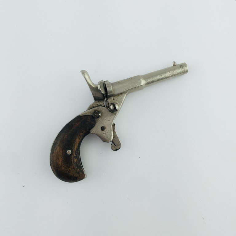 Pistola belga tipo matagatos calibre 6 mm Flobert, niquelada. Sección de caño hexagonal. Cachas en madera lisa. Largo total 11 cm. Funcionando.