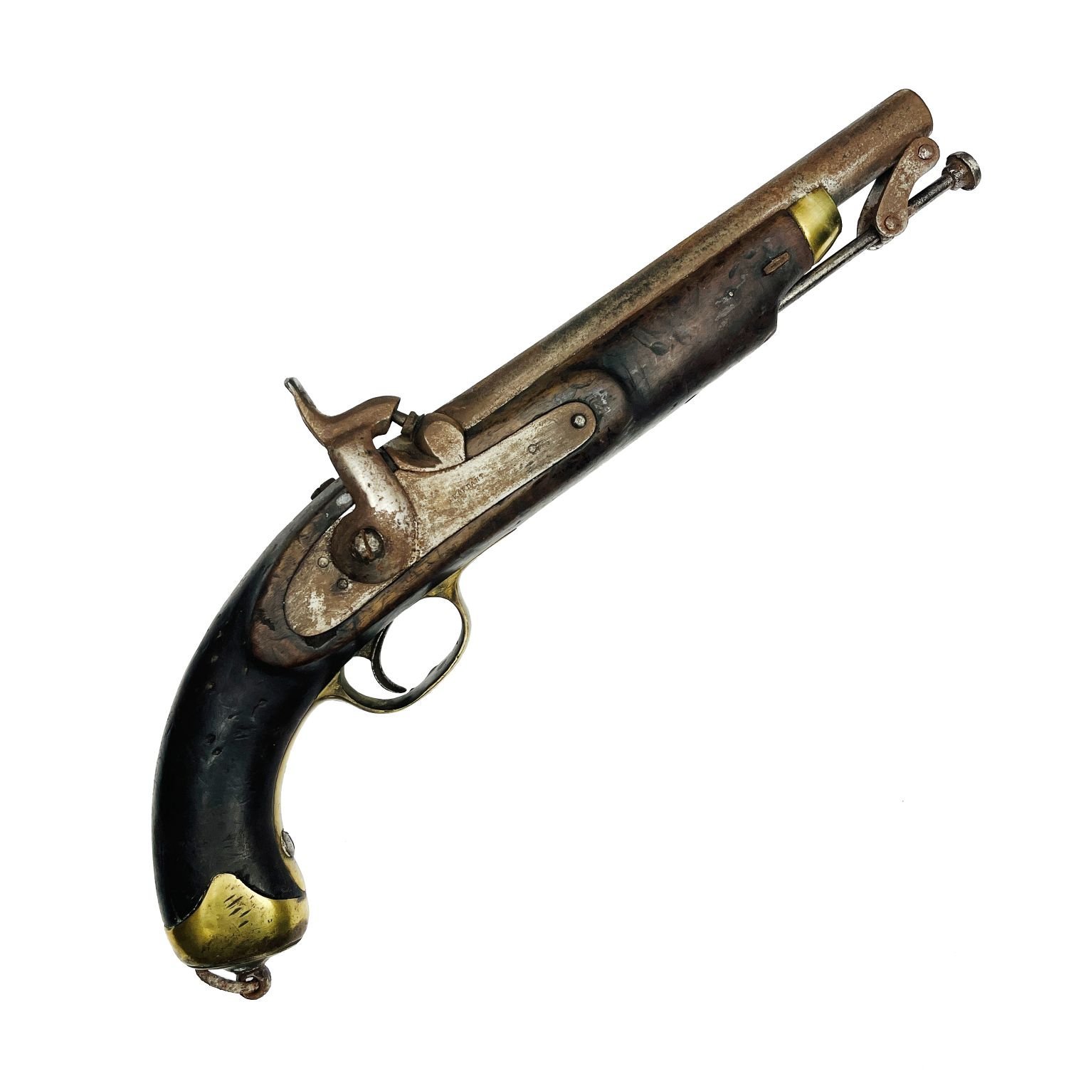 Pistola belga de caballería de avancarga, sistema de percusión. Con baqueta incorporada. Abrazadera, guardamonte y pomo en bronce liso. Fabricada por G. Mordant, Liege.