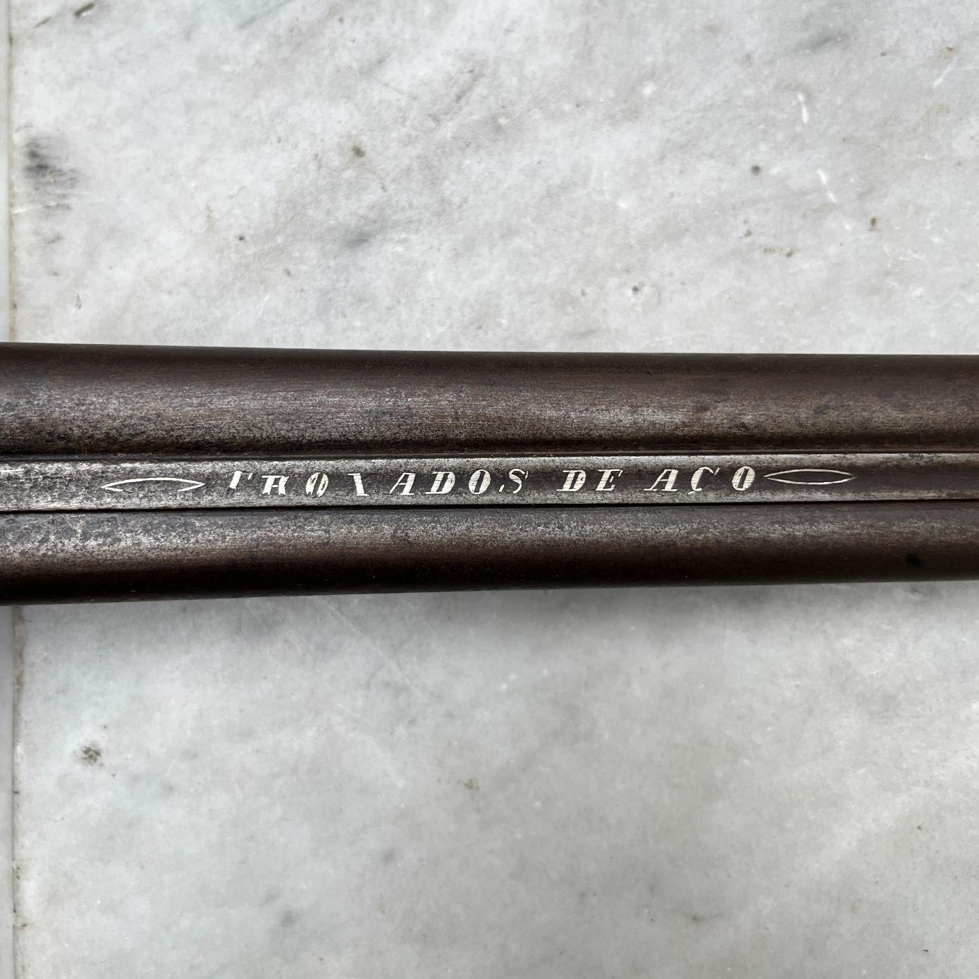 Pistola de avancarga, sistema de percusión. Dos cañones yuxtapuestos calibre 12 mm, con inscripción en plata incrustada «Troxados de Aço». Cachas en madera lisa con guarniciones y portafulminantes en alpaca. Ca. 1850. Largo 34 cm. Funcionando. Falta baqueta.